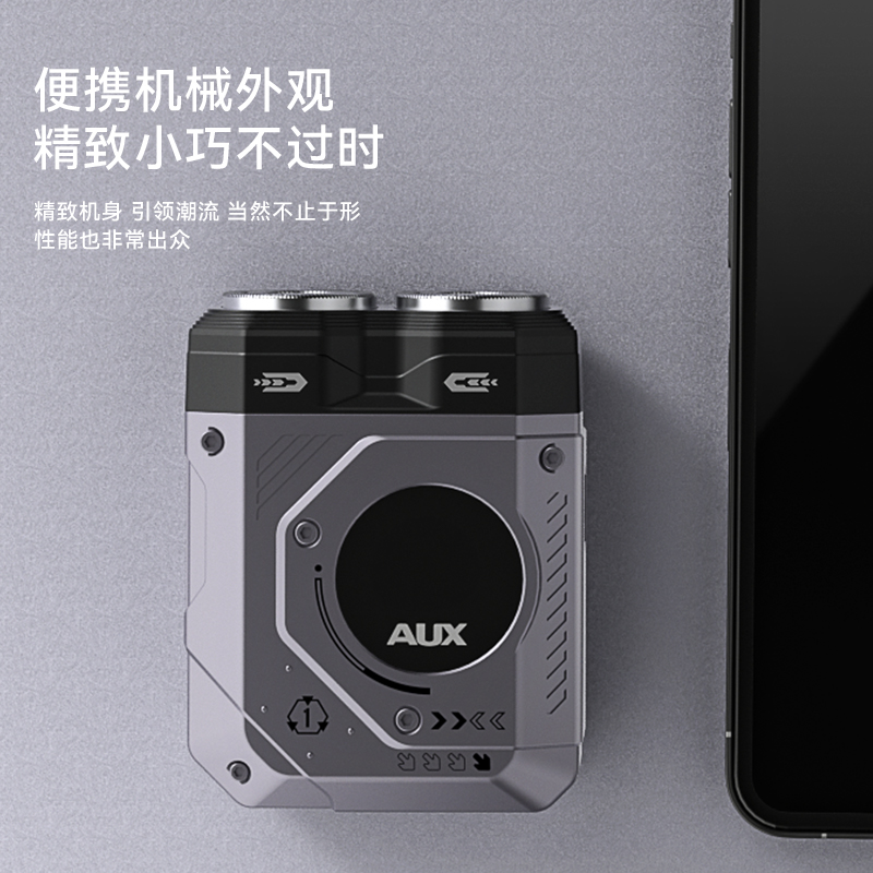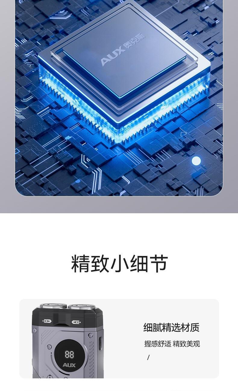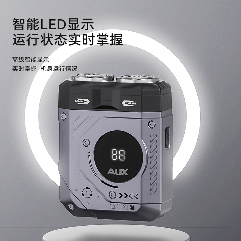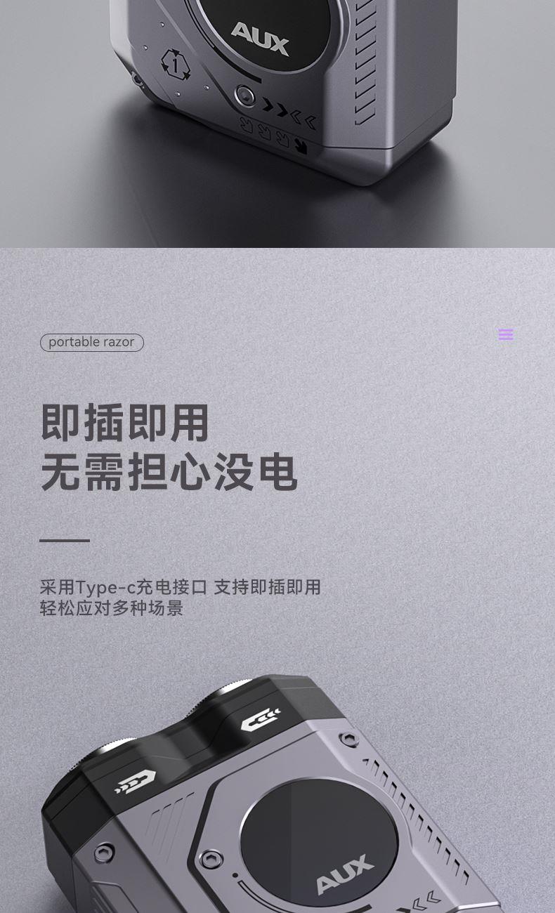 额定电压:3.7V⎓ 额定功率:5W 额定输入:5V~1A 电池容量:400mAh 防水等级:IPX7 包装清单:剃须刀,说明书,Type-C充电线,清洁刷 迷你便携,单手可握 双环浮动刀网,双倍提升进须量 TYPE-C快充,60天长效续航 IPX7级防水,机身随心洗 刀头磁吸设计,灵活好拆洗