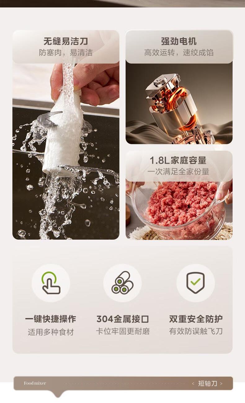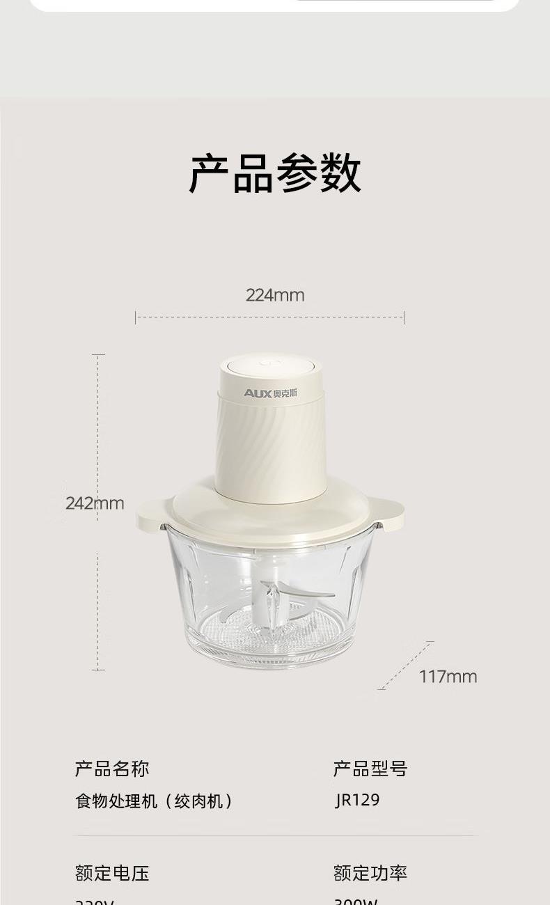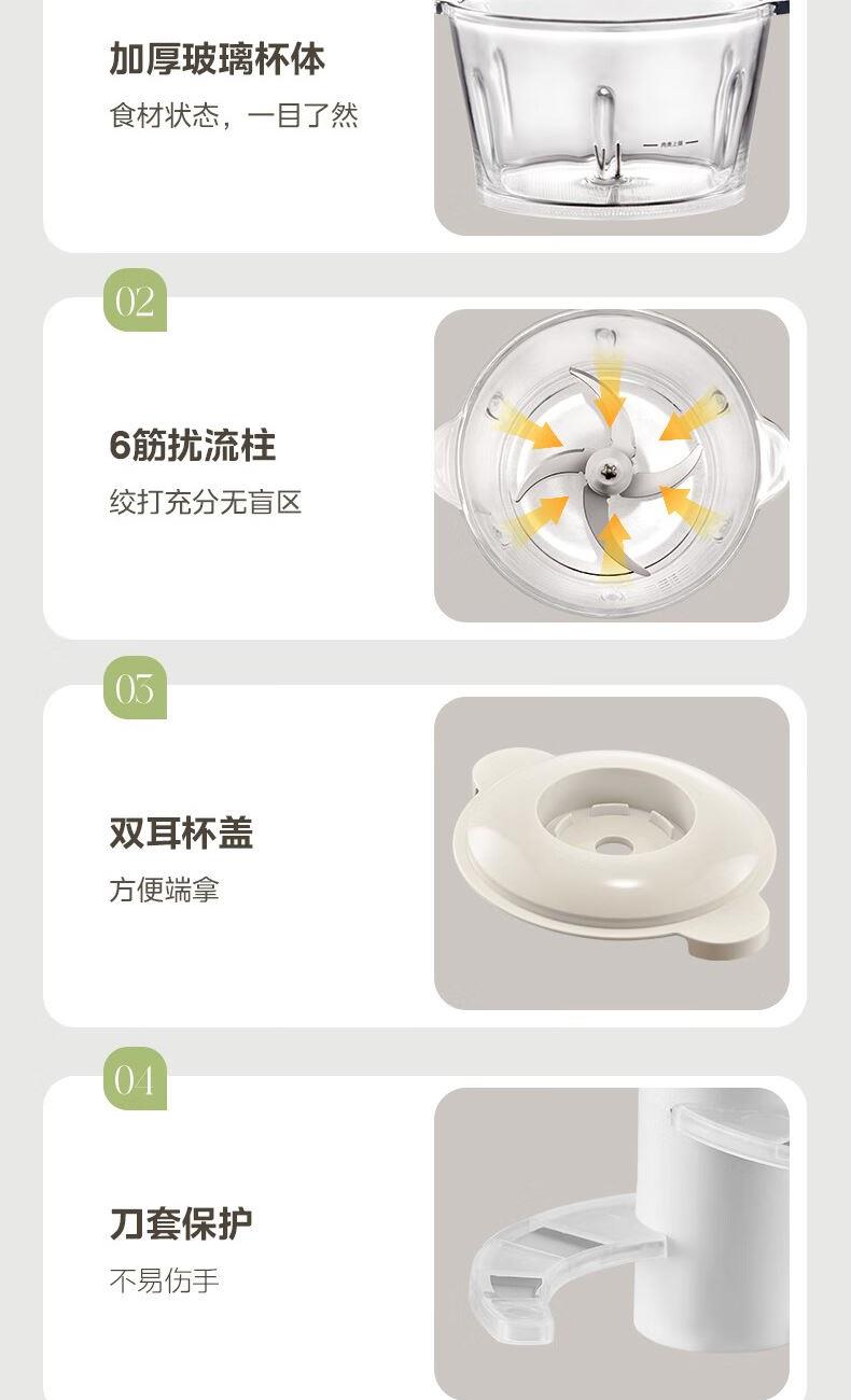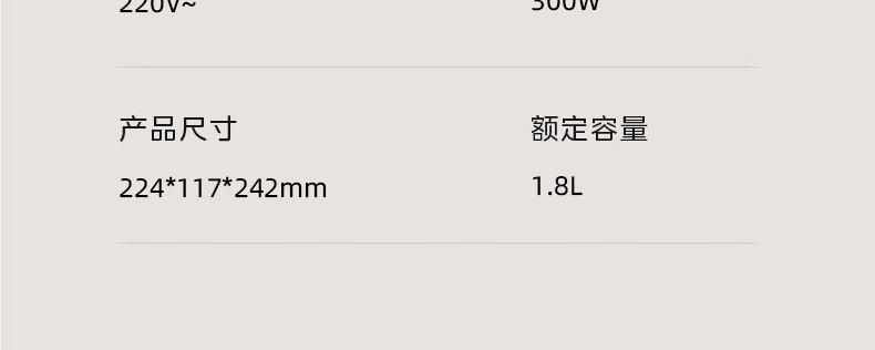 额定电压:220V~ 额定功率:300W 额定频率:50Hz 材质:杯体材质:玻璃,杯盖:PP,刀头:304不锈钢,接口:304不锈钢 无缝刀轴,一冲即净 升级安全弹扣,料理更添安心 加厚玻璃杯体,食材状态一目了然 1.8L家庭容量,全家食量不用愁 短轴4叶刀头,持久耐用