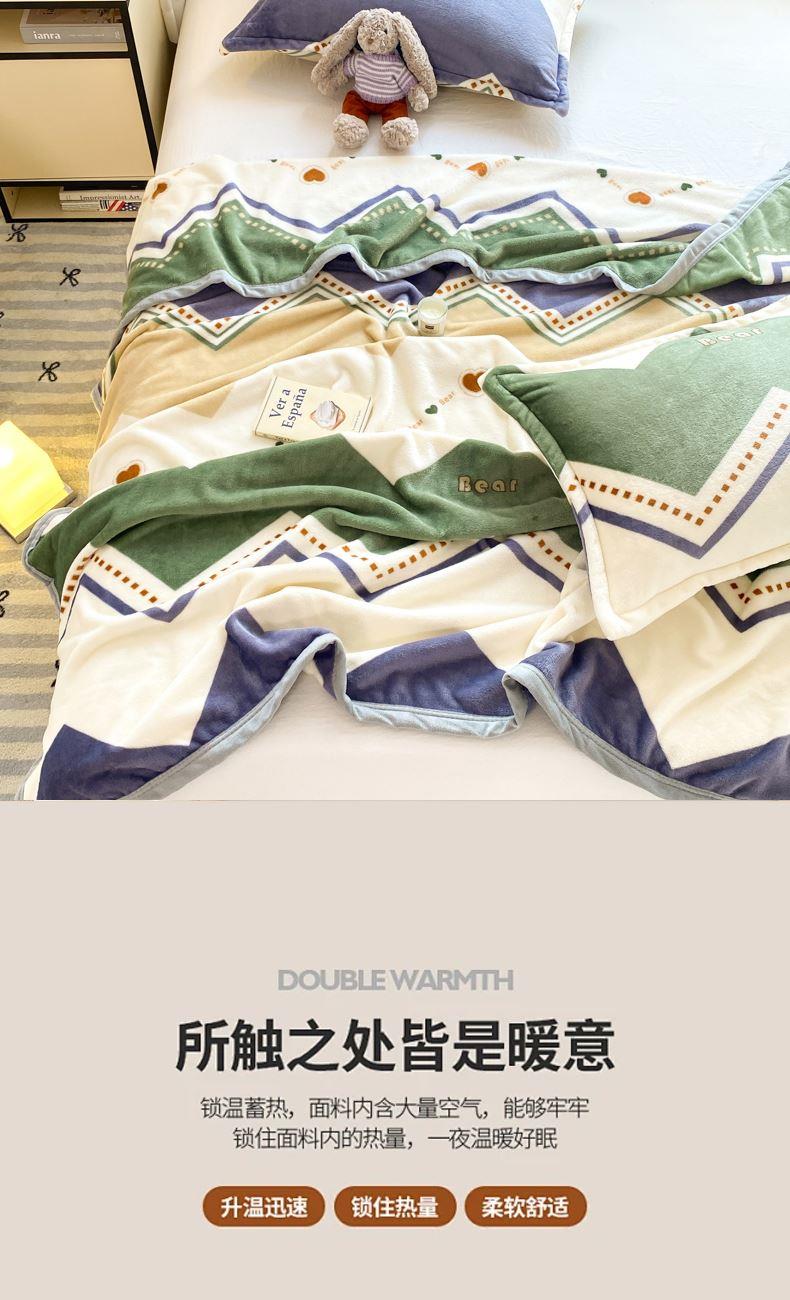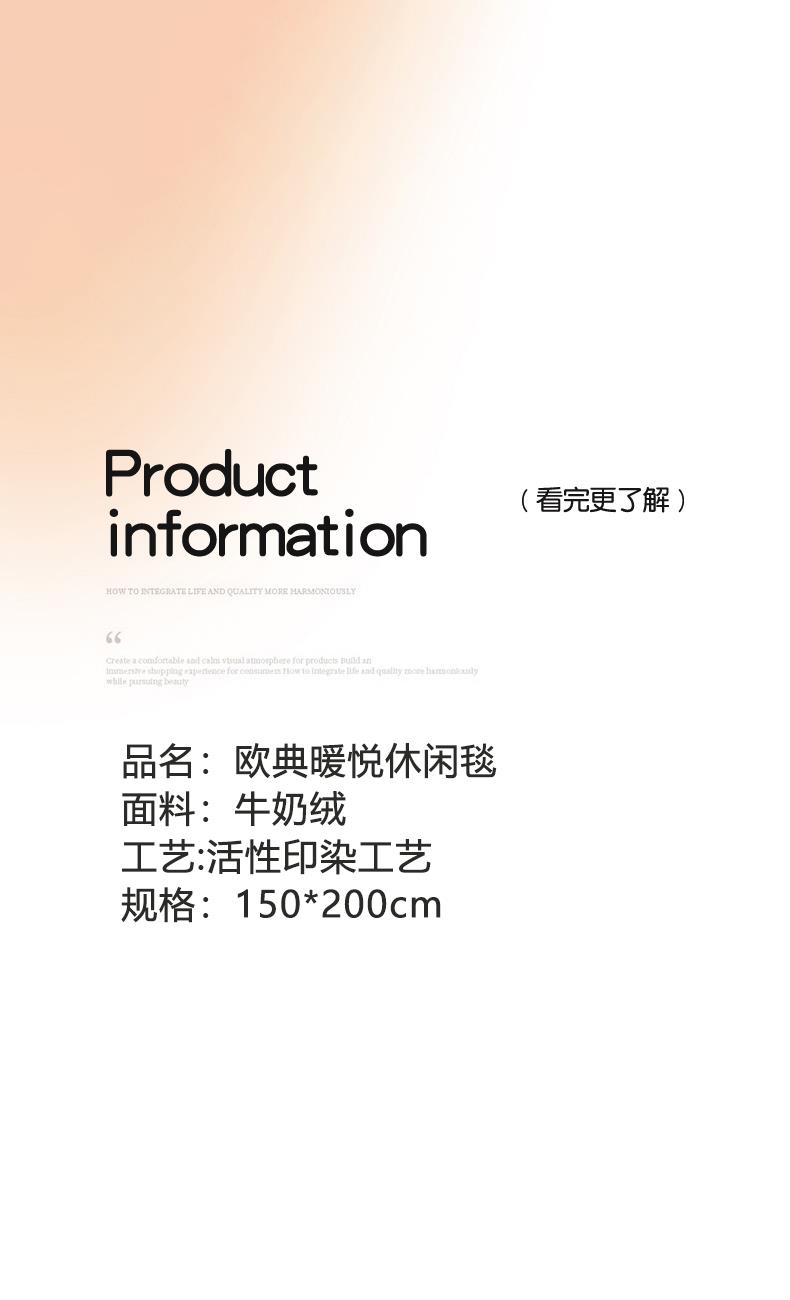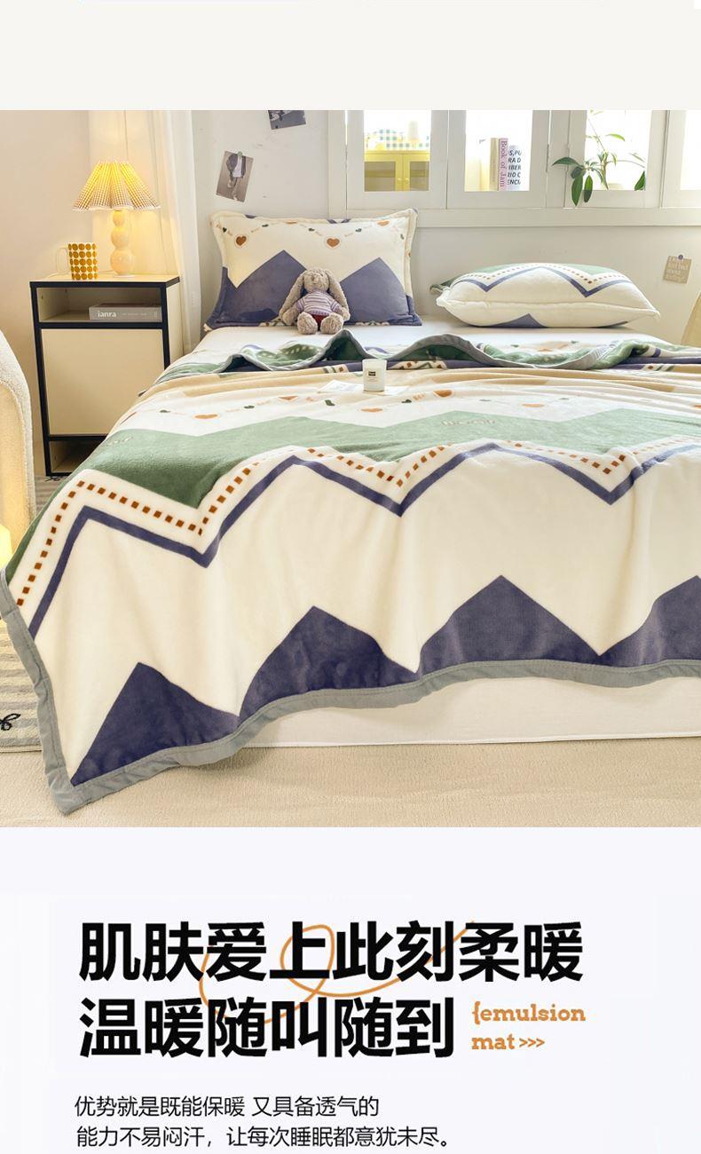 规格:150*200cm 面料:牛奶绒 克重:1000g 产品特点: 牛奶绒面料,充分吸收汗气蒸发产生的热量,舒适透气,精美大方,绒感细腻,呵护您娇嫩肌肤新型植绒技术,绒毛结构丰盈紧实,不易掉毛告别掉毛烦恼