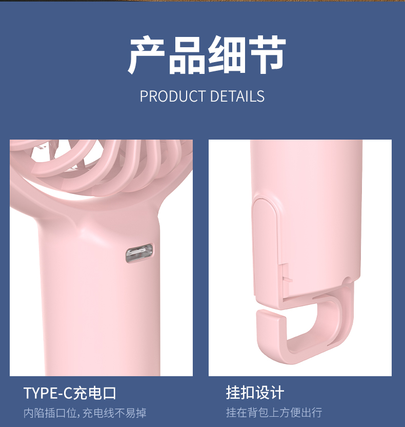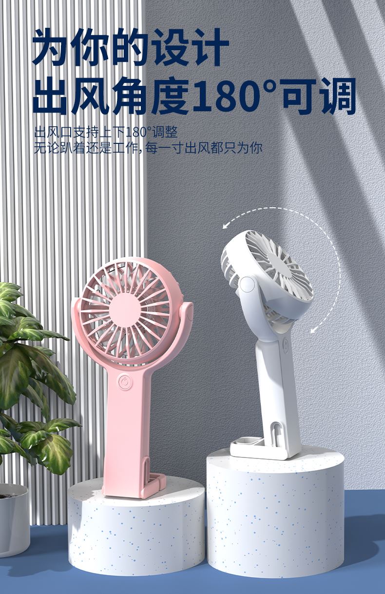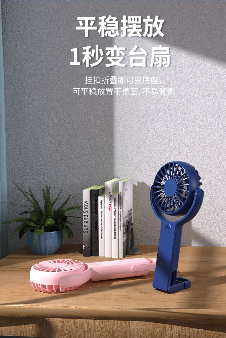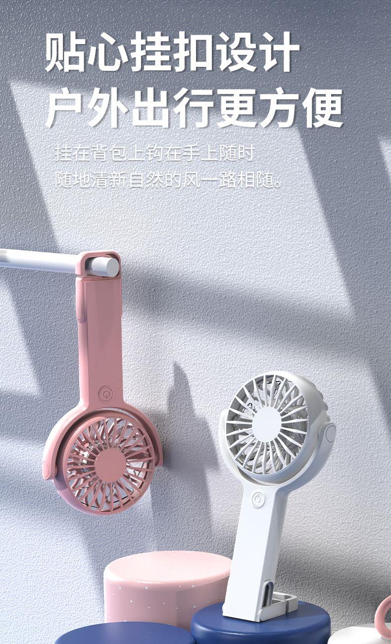 【推荐理由】: 精致小巧,方便携带 可挂背包,可立桌面 多场景 三档风速可调 可上下调节角度 颜色:白色 蓝色 粉色 尺寸:185*91*30mm 容量:800mAh 包装:彩盒包装