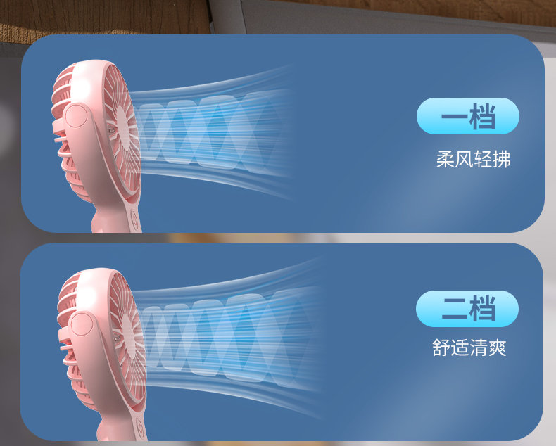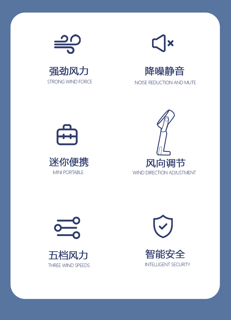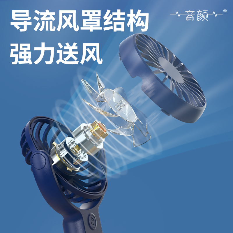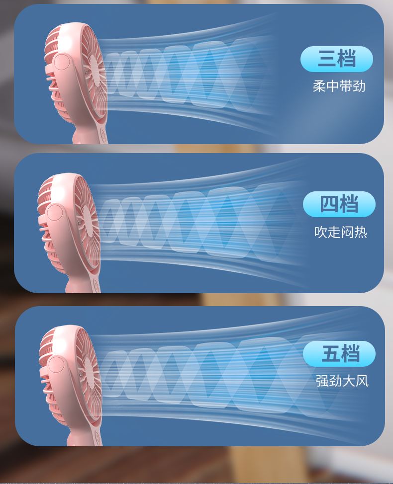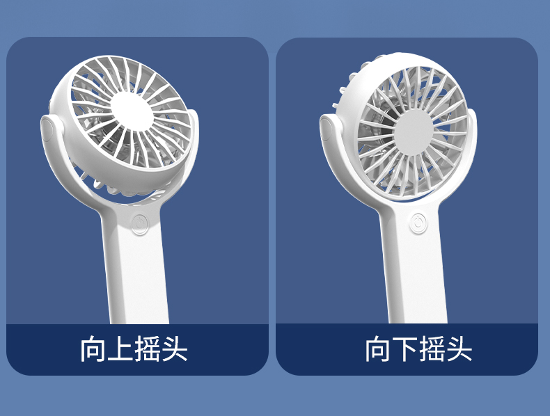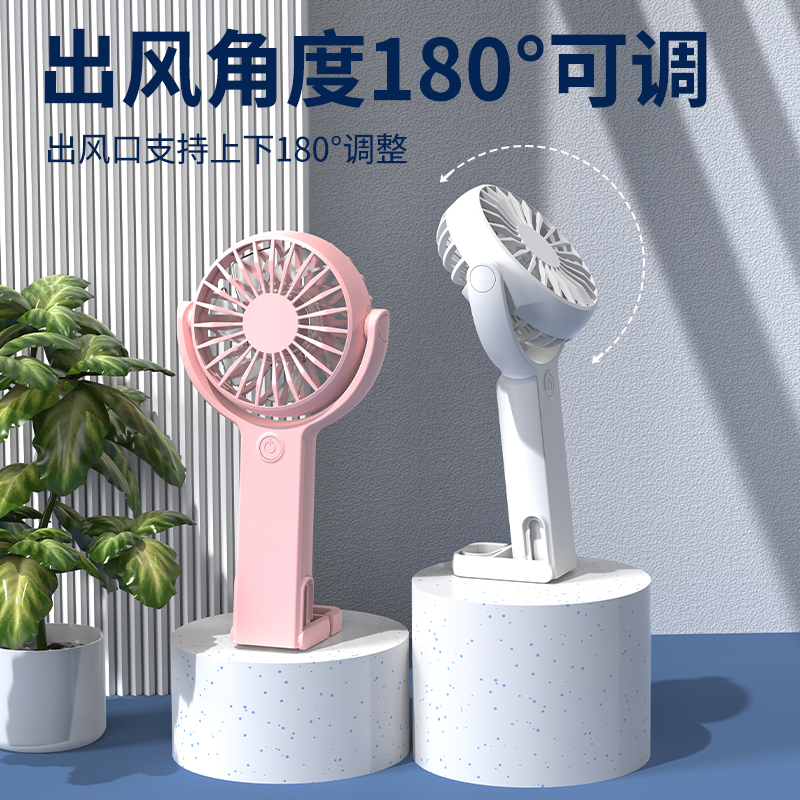 【推荐理由】: 精致小巧,方便携带 可挂背包,可立桌面 多场景 三档风速可调 可上下调节角度 颜色:白色 蓝色 粉色 尺寸:185*91*30mm 容量:800mAh 包装:彩盒包装