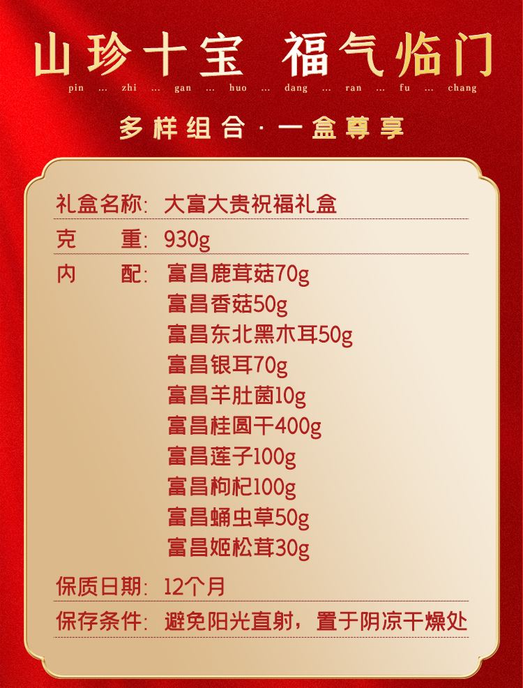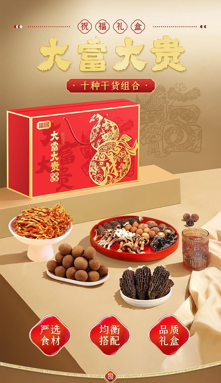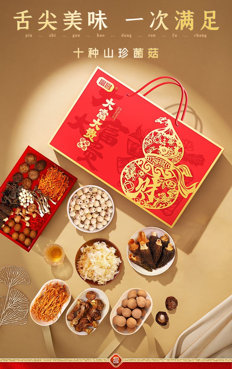 富昌鹿茸菇70g 富昌香菇50g 富昌东北黑木耳50g 富昌银耳70g 富昌羊肚菌10g 富昌桂圆干400g 富昌莲子100g 富昌枸杞100g 富昌蛹虫草50g 富昌姬松茸30g