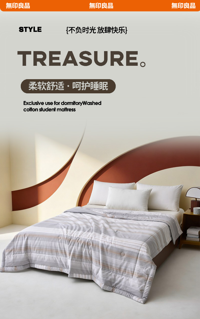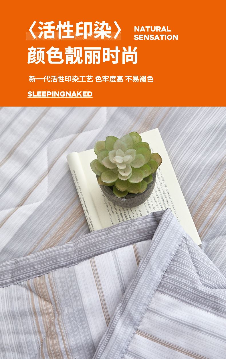 规格:180*200cm 面料:双层纱 填充:羽丝棉 克重:1100g 执行标准:GB/T22796-2021 安全类别:GB18401-2010 B类 1.甄选优质双层纱面料,纤维柔软蓬松,手感柔软,拉力强度高,织物贴身舒适; 2.填充物选用优质A类整张羽丝棉纤维手感犹如羽绒般,轻盈蓬松,柔软舒适 3.采用单边暗合缝制,定点绗缝工艺,日式简约设计风格,简约时尚,让您感受科技生态睡眠!