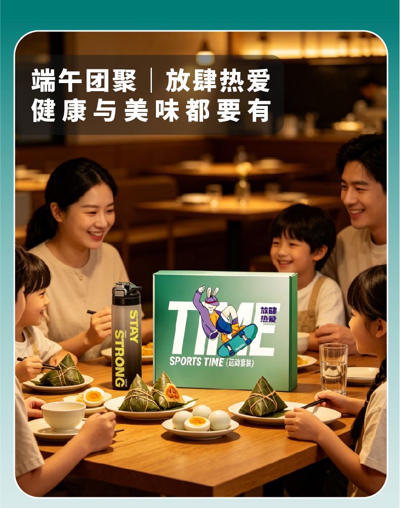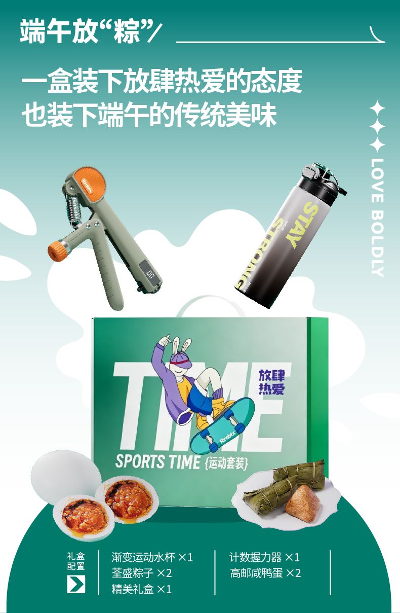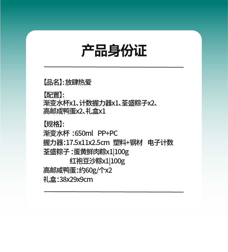 礼盒配置:渐变运动水杯* 1、荃盛粽子*2 计数握力器* 1 南湖牌高邮咸鸭蛋* 2、礼盒* 1