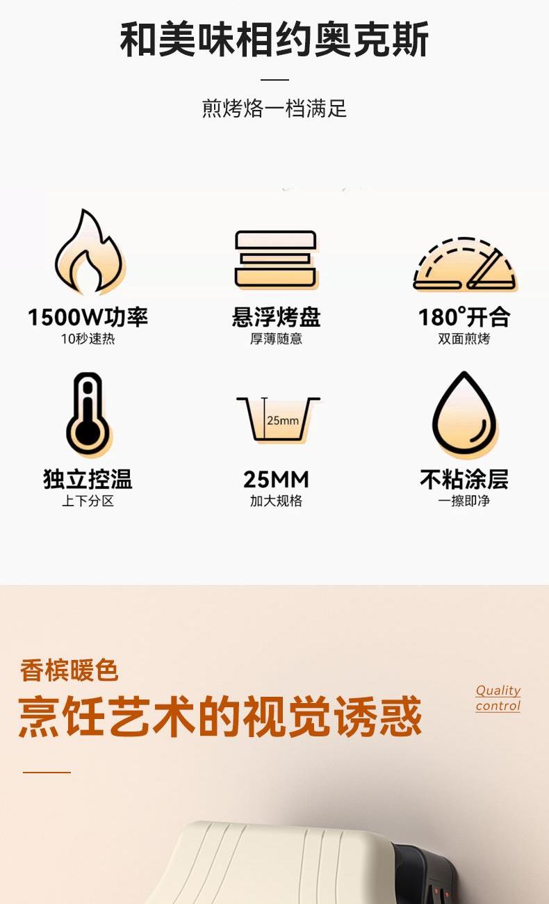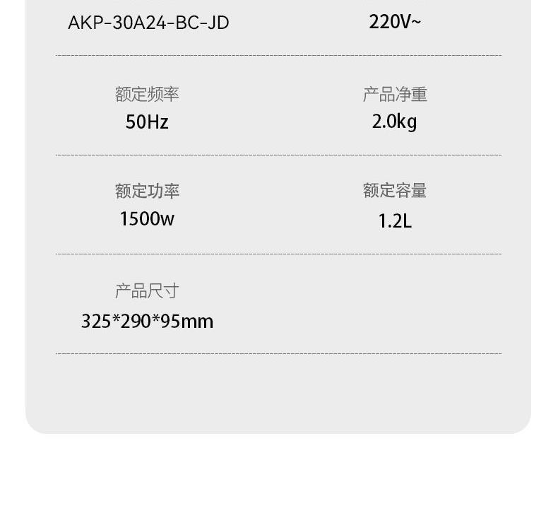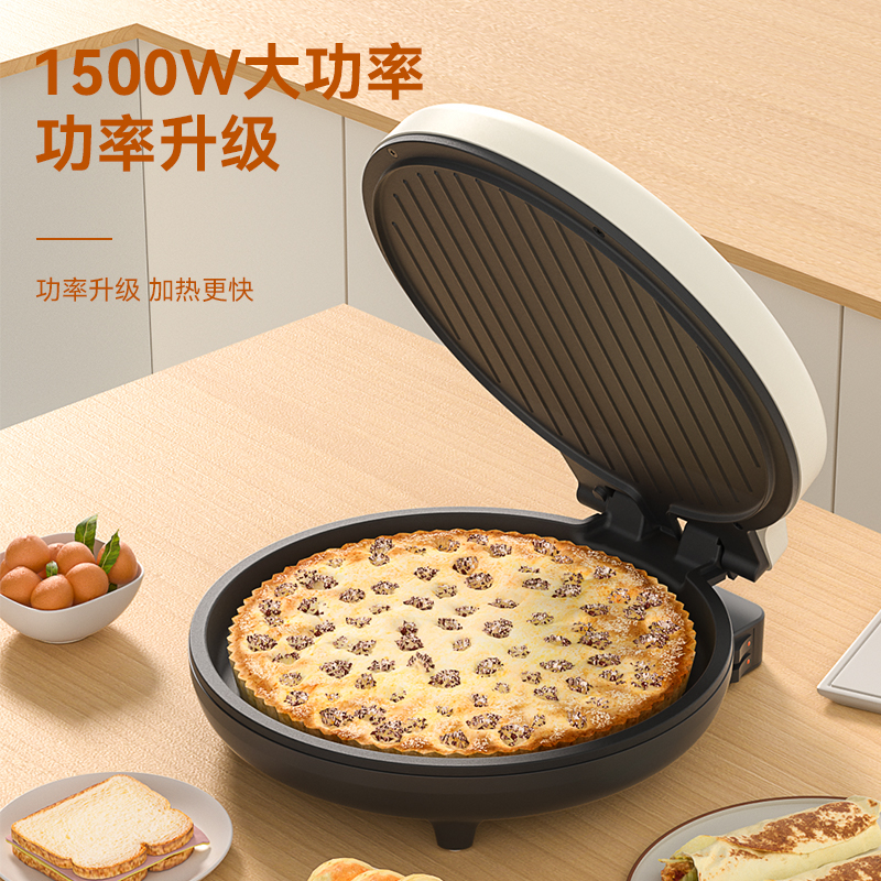 额定电压:220V~ 额定功率:1500W 额定频率:50Hz 烤盘口径:30cm 烤盘深度:2.5cm 材质:加热盘:铝合金+不沾涂层 外壳:电胶木 180°/105°开合一机多用,上烤下烙一铛满足 环形加粗发热管,10秒速热不必等 悬浮烤盘厚薄随意,不粘涂层一擦即净 独立控温,上下盘自由控制 30CM大容量,满足大家庭需求