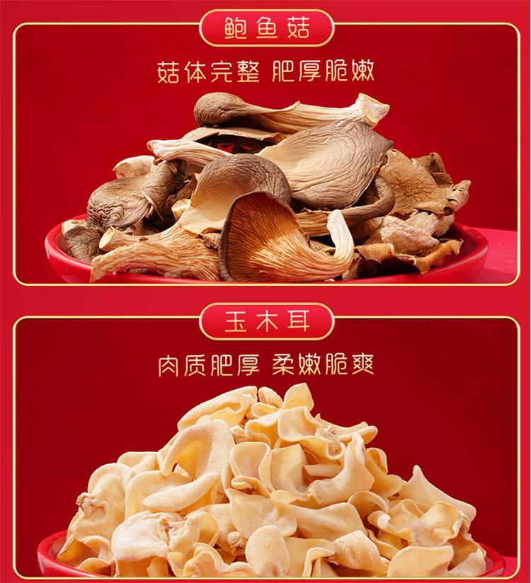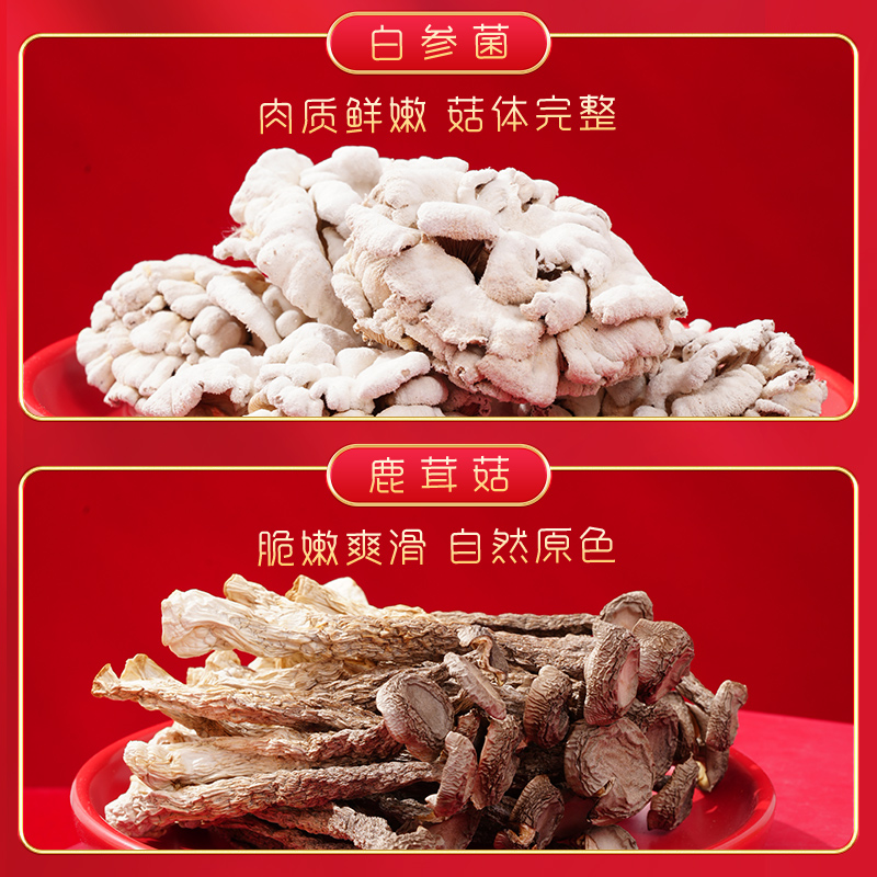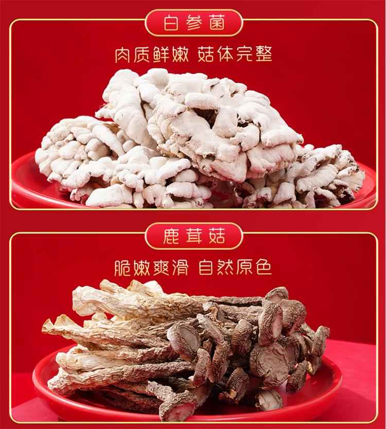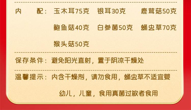 玉木耳75g 鹿茸菇50g 鲍鱼菇40g 白参菌50g 蛹虫草70g 猴头菇50g 银耳(片状)30g
