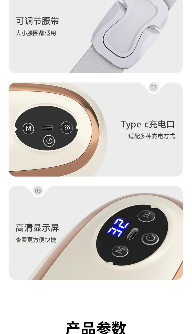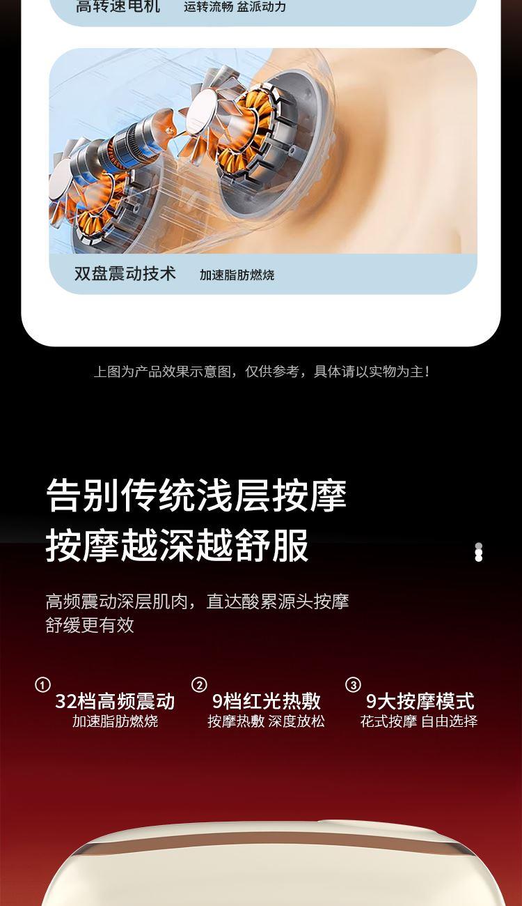 彩盒尺寸:220*125*85mm 黄包尺寸:225*130*90mm 外箱尺寸:550*310*510mm 包装材料:彩盒+邮购盒 69码:6977778242786 额定输入:5V⎓ 工作电压:3.7V⎓ 额定功率:10Wf材质:ABS > 根据人体工程学设计,美观舒适 > 内设15分钟定时自动关机功能 > 采用PI发热技术、9档发热、9个模式、32档力度调节,可根据自身来选择