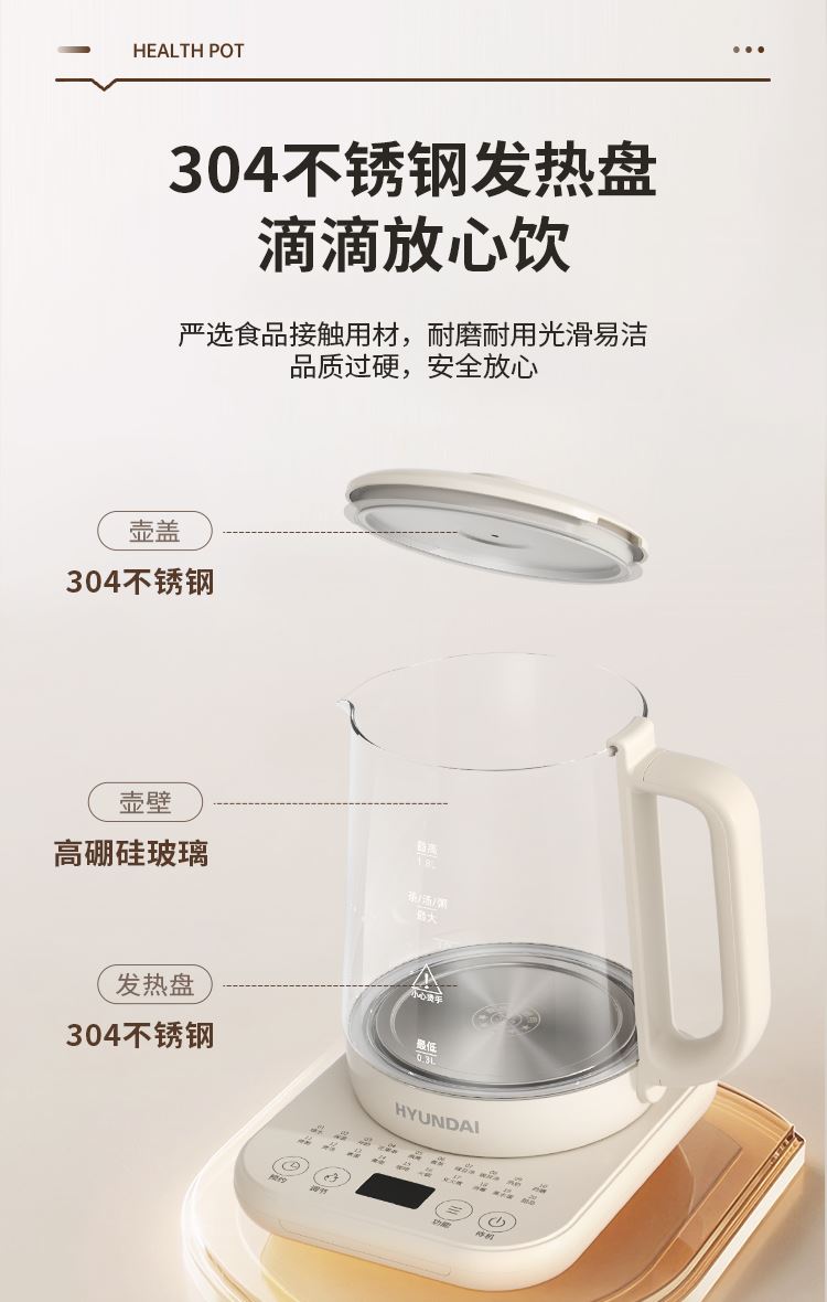 > 高硼硅玻璃,耐高温,304不锈钢发热盘,安心煮