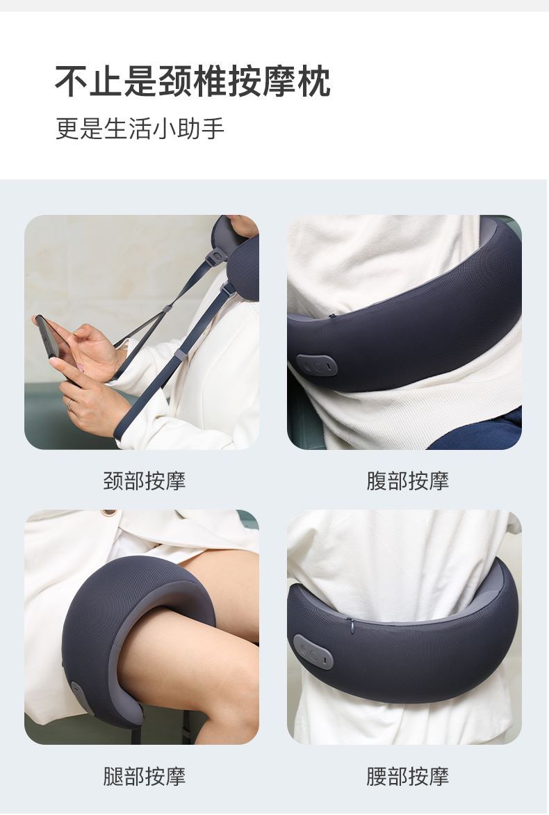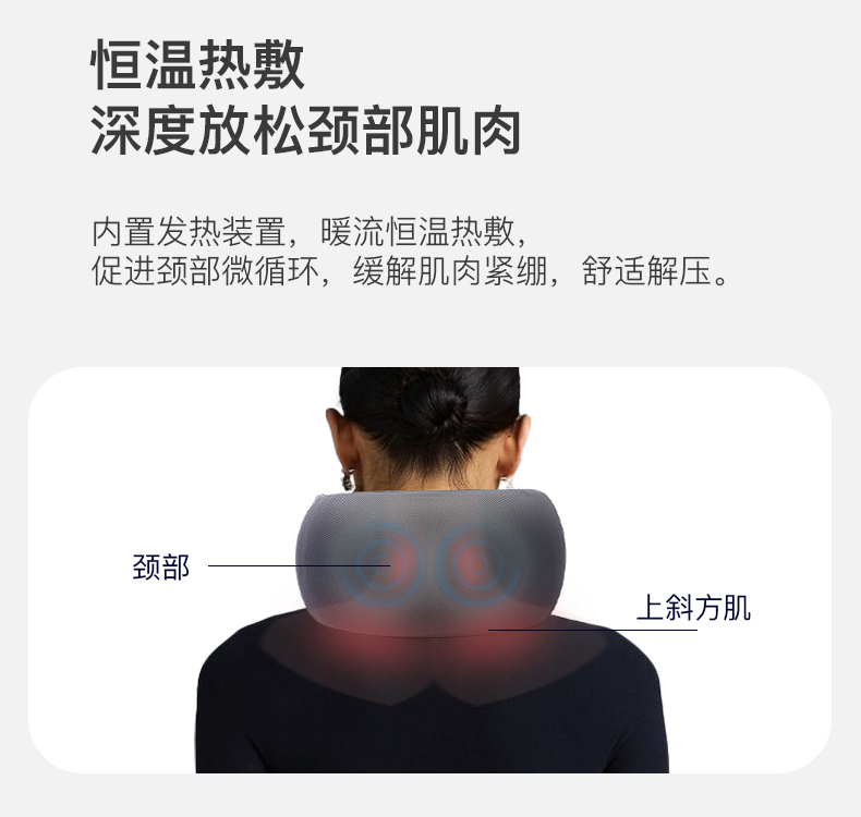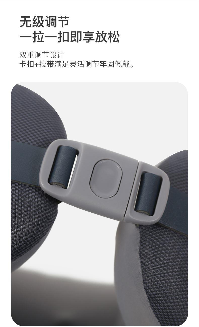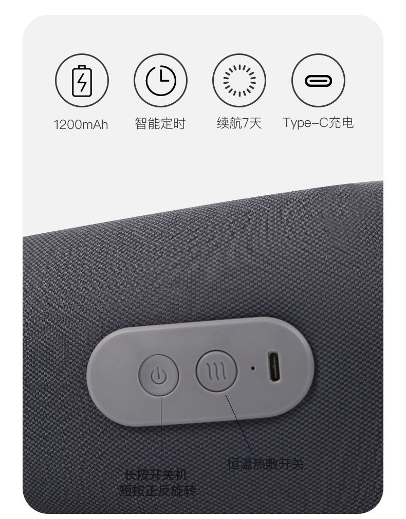 材质:瑜伽布料,回弹记忆棉,PU材质 充电口:TypeC 产品尺寸:220*220*115mm 产品净重:500g 额定功率:3.7W 电池容量:1200mAh • 仿真人按摩手感 强电机高配 • 360°环颈支撑 高密度回弹记忆棉 • C口便捷携带可充电 智能定时15分钟模式 • 恒温热敷功能可选 ,质保一年,只换不修