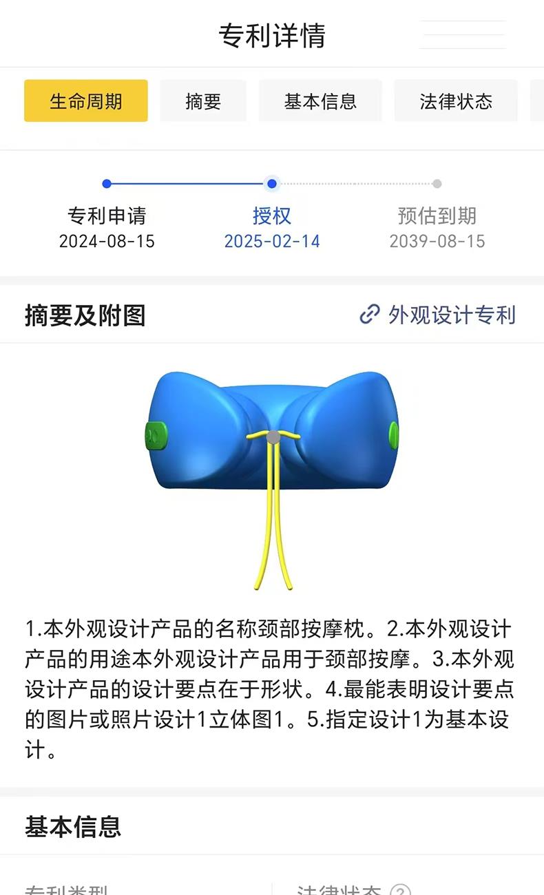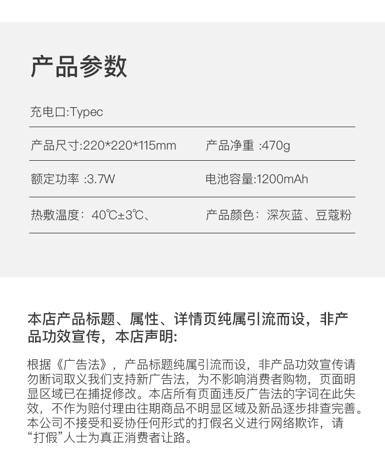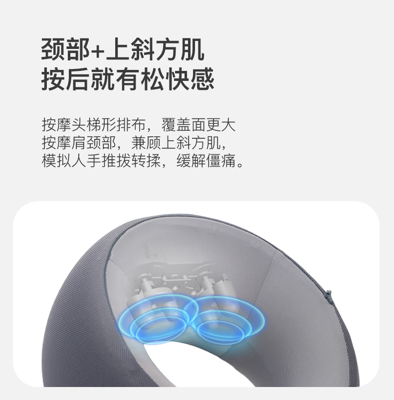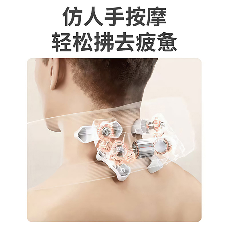 材质:瑜伽布料,回弹记忆棉,PU材质 充电口:TypeC 产品尺寸:220*220*115mm 产品净重:500g 额定功率:3.7W 电池容量:1200mAh • 仿真人按摩手感 强电机高配 • 360°环颈支撑 高密度回弹记忆棉 • C口便捷携带可充电 智能定时15分钟模式 • 恒温热敷功能可选 ,质保一年,只换不修