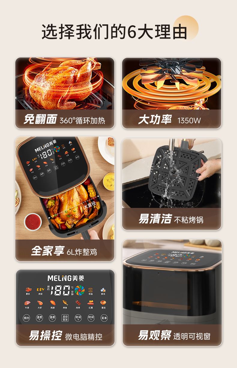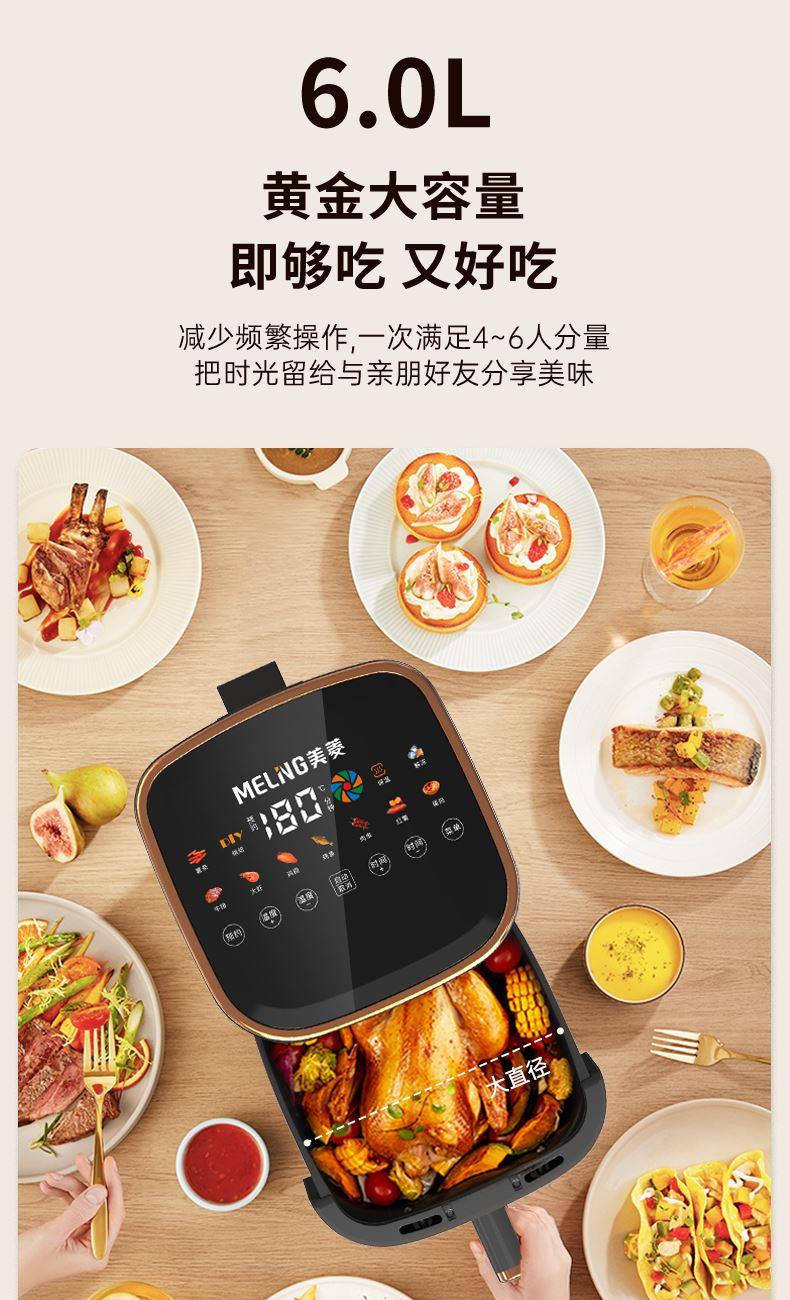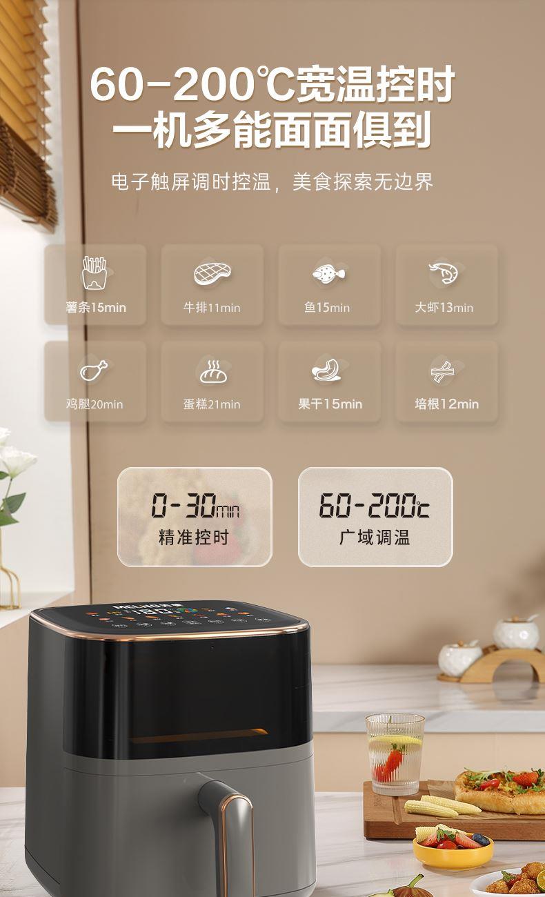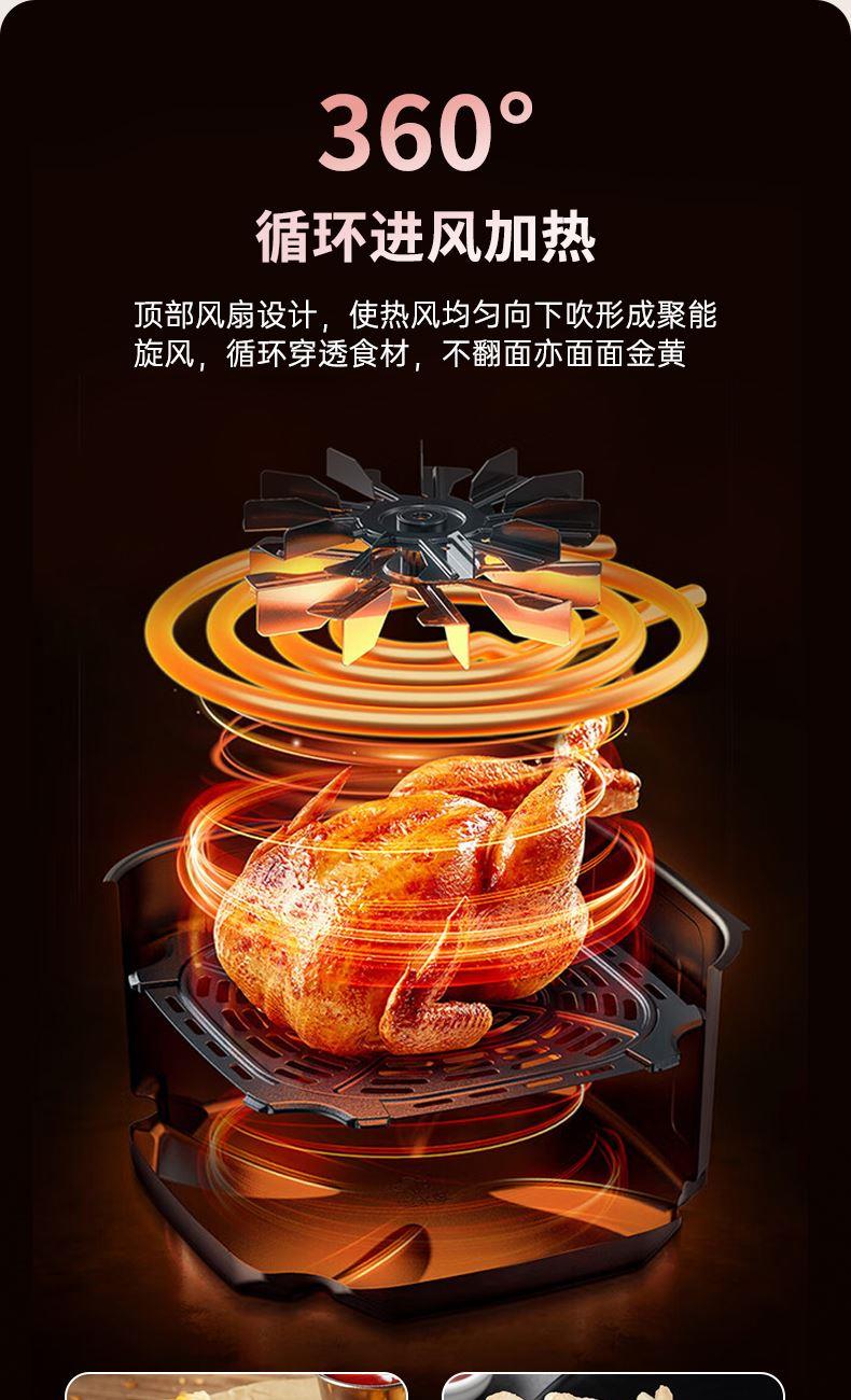 产品参数: 额定容量:6L 额定功率:1350W 操作方式:电子触控面板 定时范围:0-30min 调温范围:60-200℃ 产品净重/毛重:3.8kg/4.4kg 产品尺寸:265*355*300mm 产品卖点: 1.透明大视窗,360℃循环加热 2.电子触屏调时控温,微电脑精控 3.大功率1350W,免翻面 4.6L大容量 可视炸篮,开抽屉自动断电
