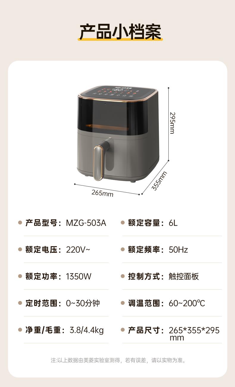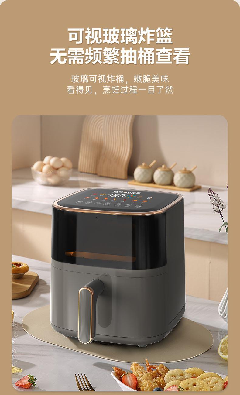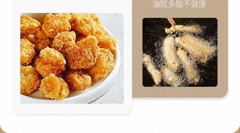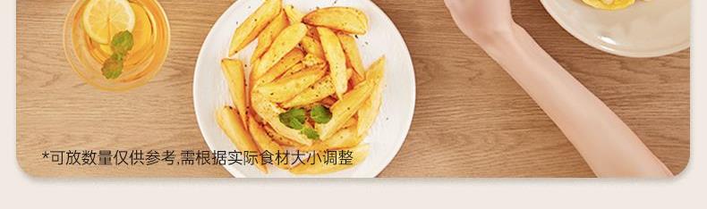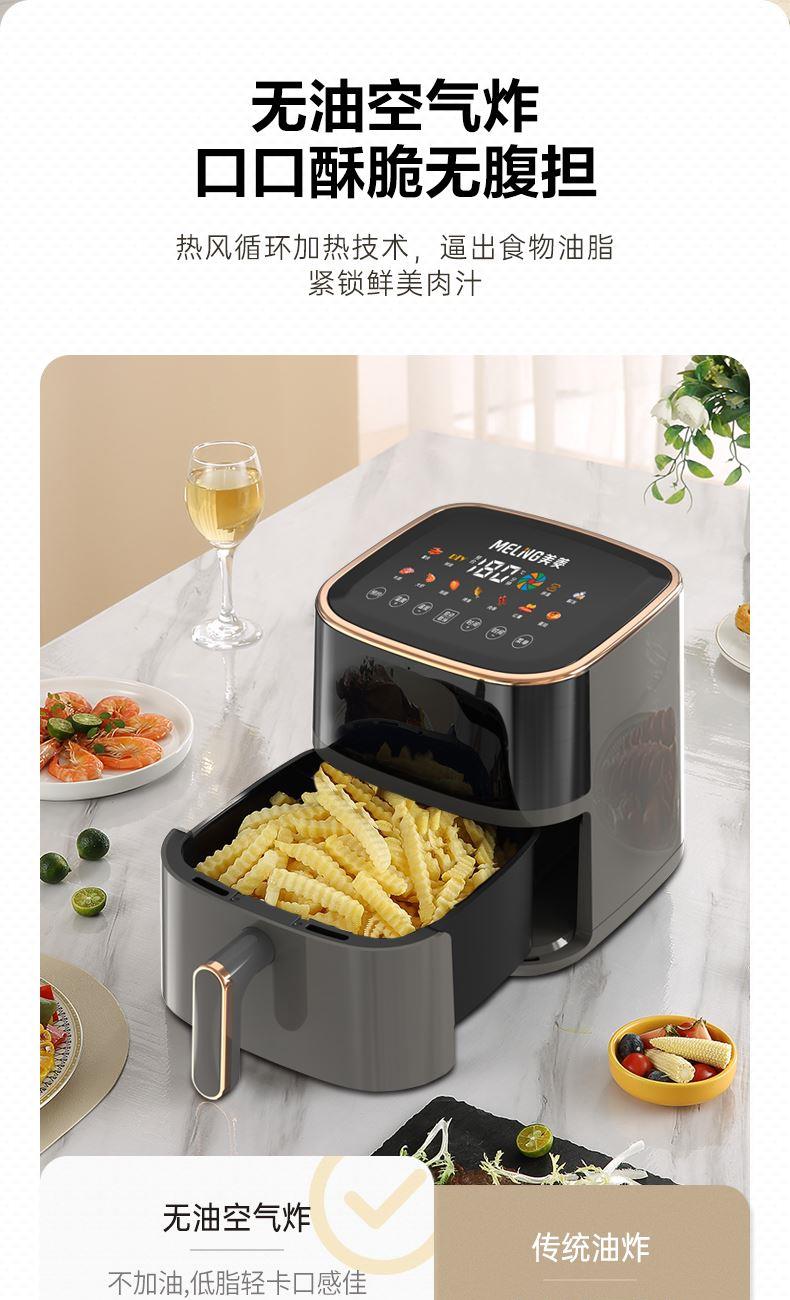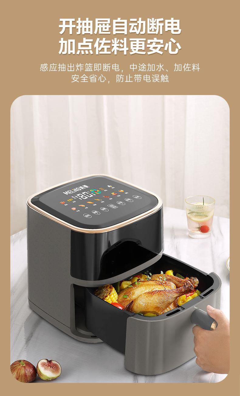 产品参数: 额定容量:6L 额定功率:1350W 操作方式:电子触控面板 定时范围:0-30min 调温范围:60-200℃ 产品净重/毛重:3.8kg/4.4kg 产品尺寸:265*355*300mm 产品卖点: 1.透明大视窗,360℃循环加热 2.电子触屏调时控温,微电脑精控 3.大功率1350W,免翻面 4.6L大容量 可视炸篮,开抽屉自动断电