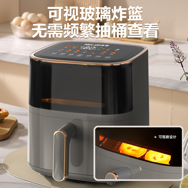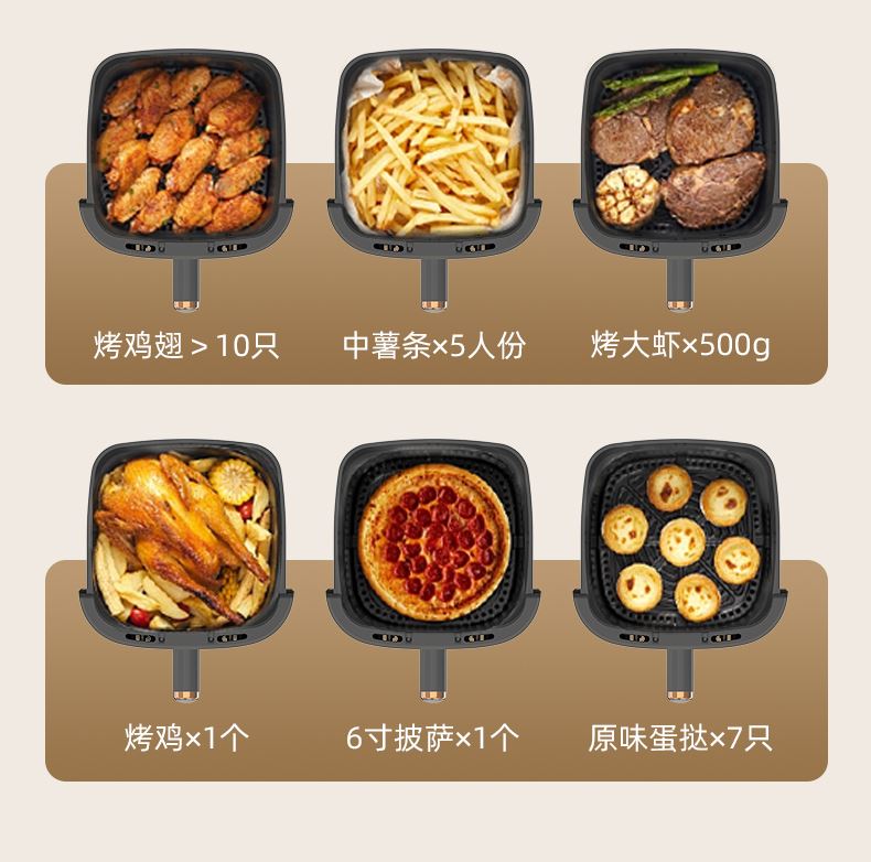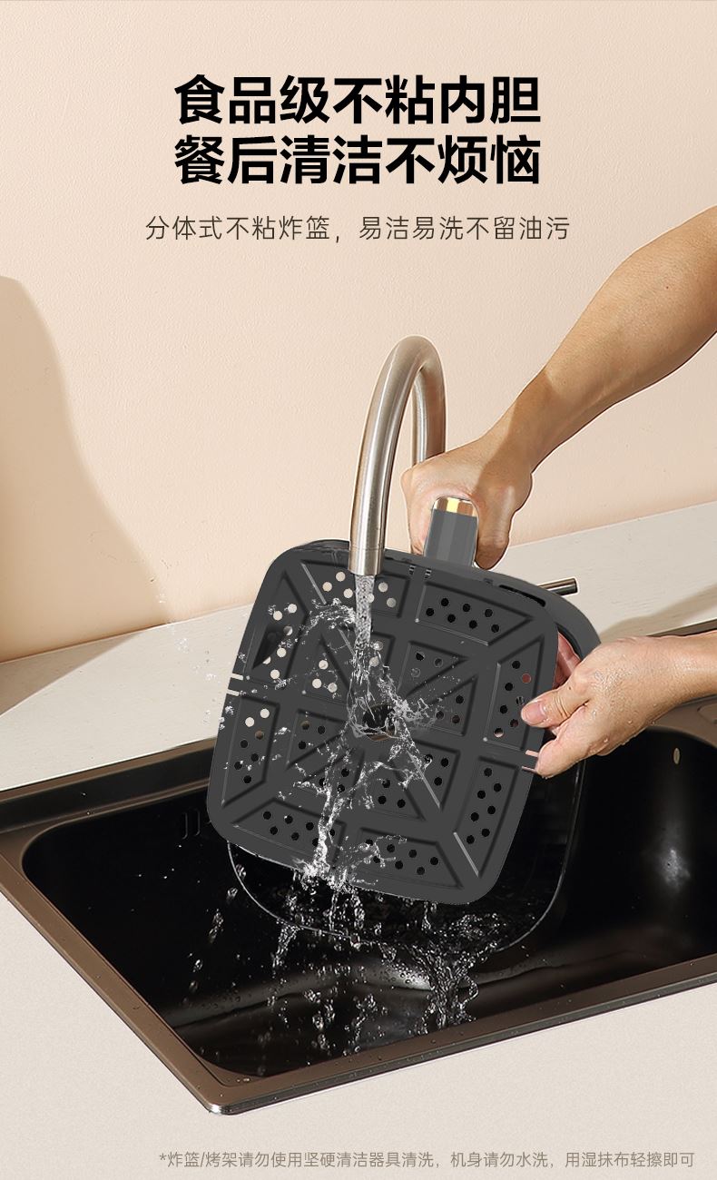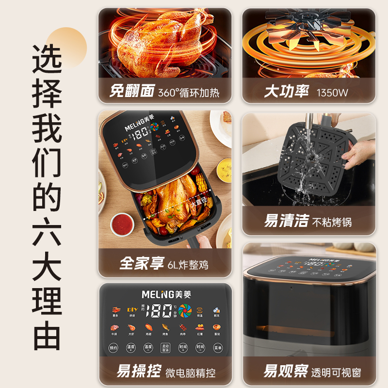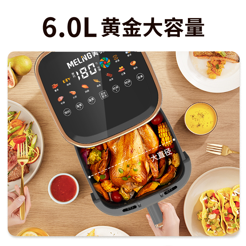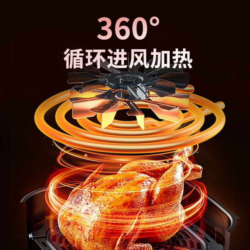 产品参数: 额定容量:6L 额定功率:1350W 操作方式:电子触控面板 定时范围:0-30min 调温范围:60-200℃ 产品净重/毛重:3.8kg/4.4kg 产品尺寸:265*355*300mm 产品卖点: 1.透明大视窗,360℃循环加热 2.电子触屏调时控温,微电脑精控 3.大功率1350W,免翻面 4.6L大容量 可视炸篮,开抽屉自动断电