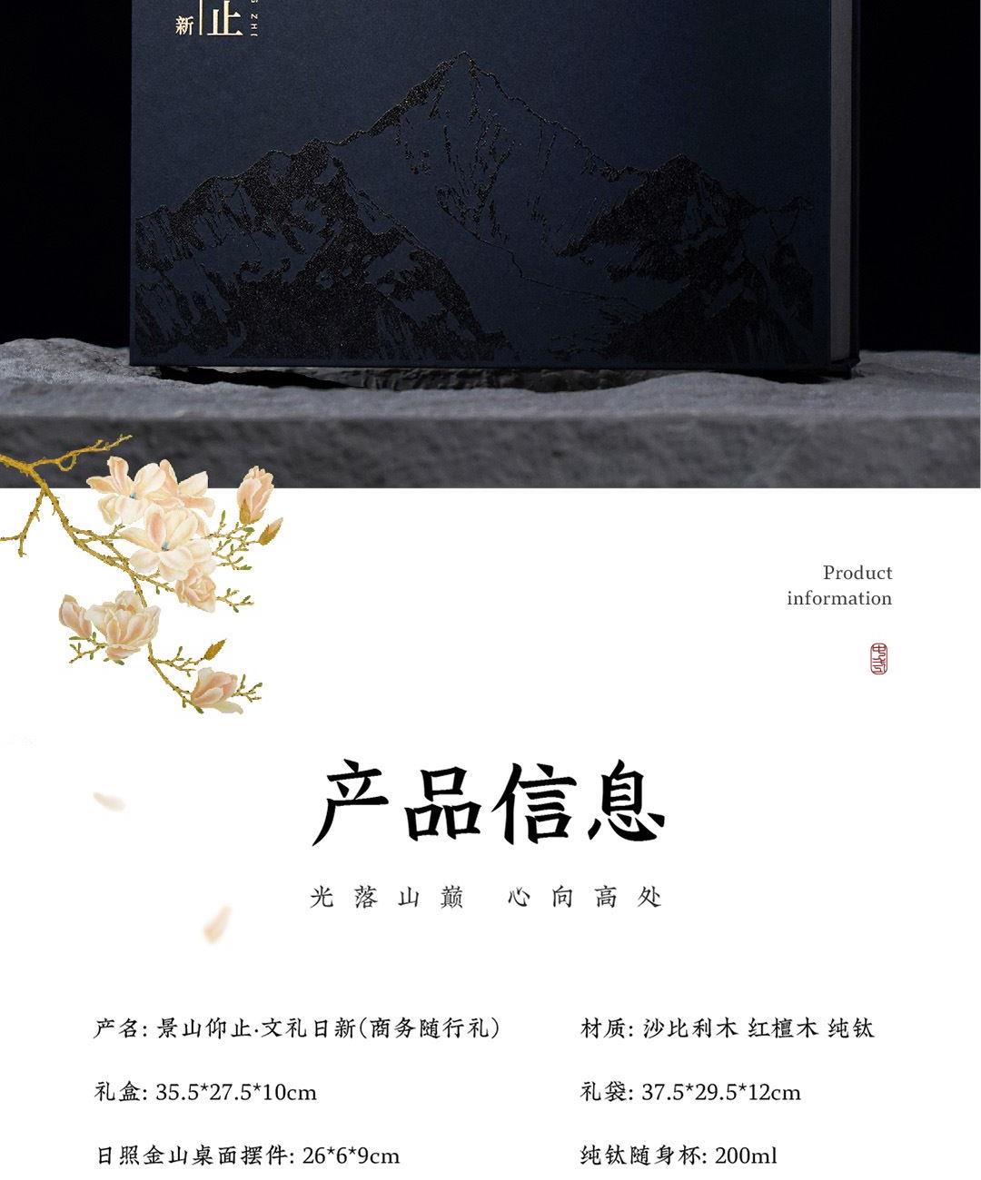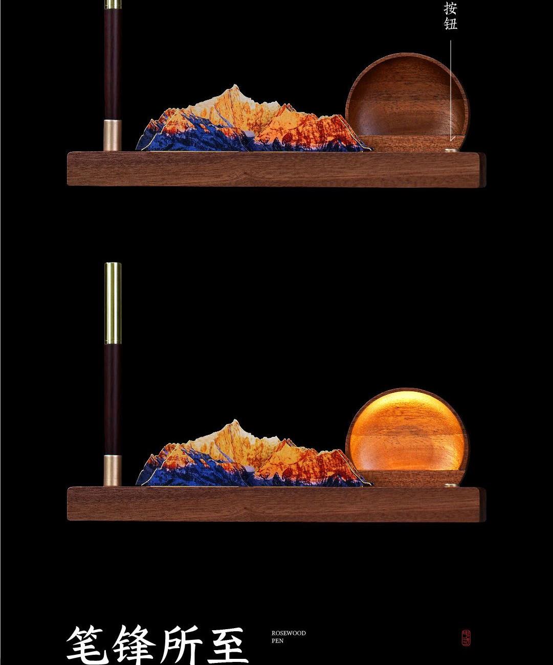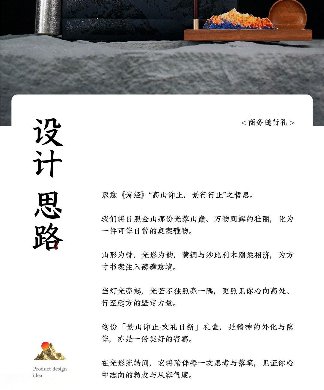 取意《诗经》“高山仰止,景行行止”之哲思。我们将日照金山那份光落山巅、万物同辉的壮丽,化为一件可伴日常的桌案雅物。山形为骨,光影为韵,黄铜与沙比利木刚柔相济,为方寸书案注入磅礴意境。当灯光亮起,光芒不独照亮一隅,更照见你心向高处、行至远方的坚定力量。这份「景山仰止·文礼日新」礼盒,是精神的外化与陪伴,亦是一份美好的寄寓。在光影流转间,它将陪伴每一次思考与落笔,见证你心中志向的勃发与从容气度。