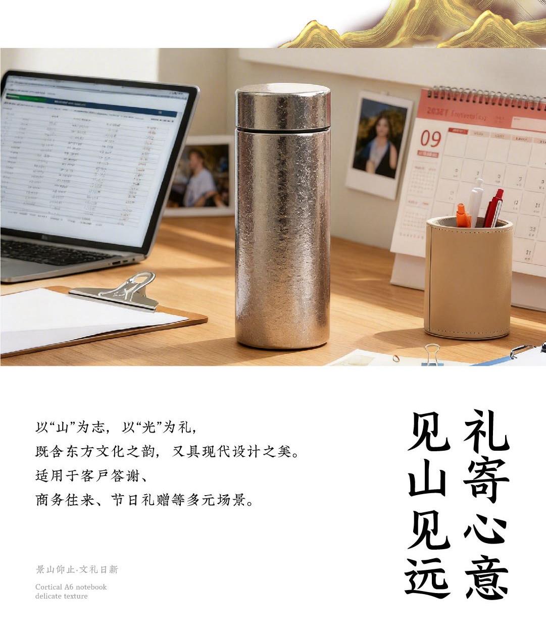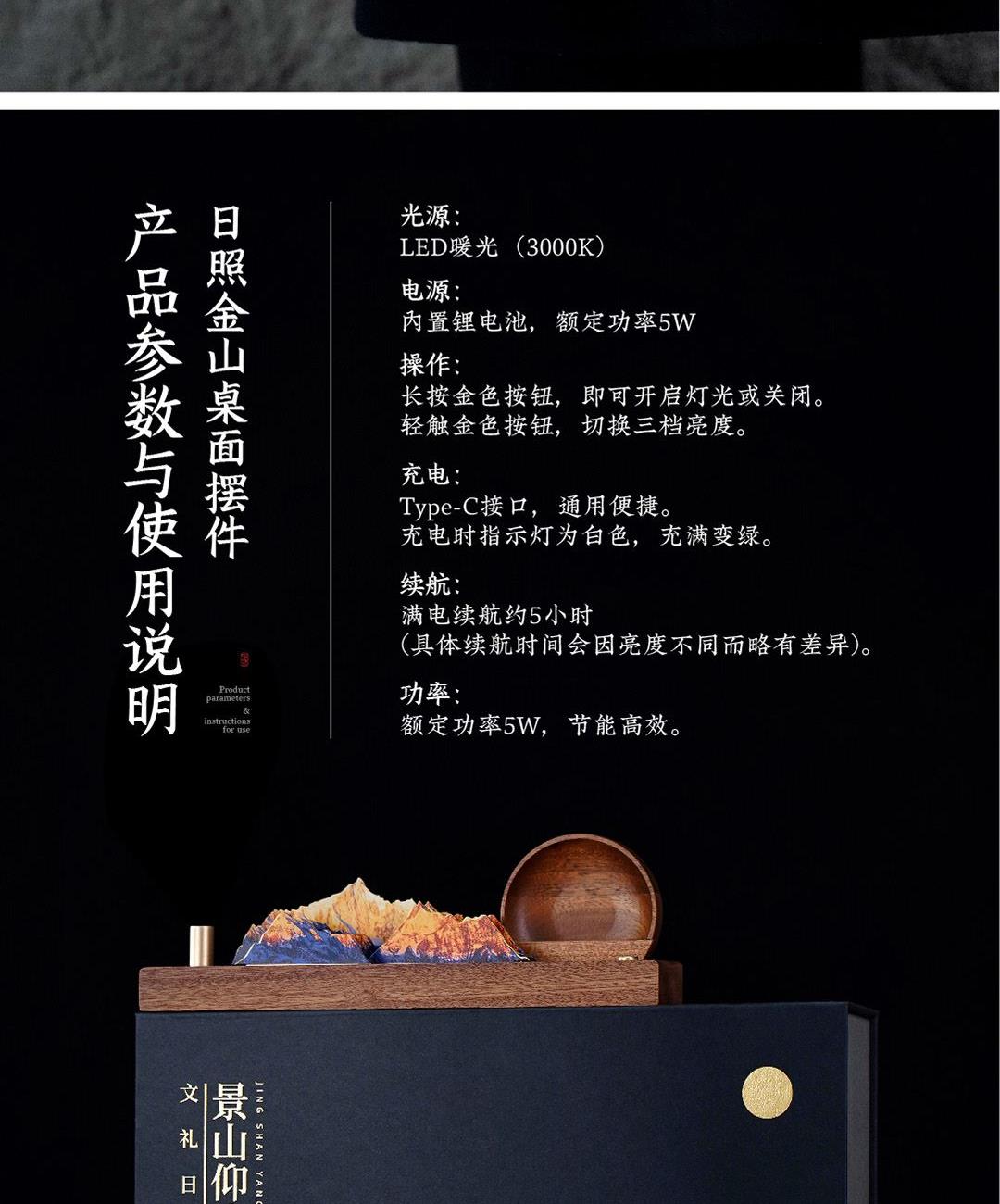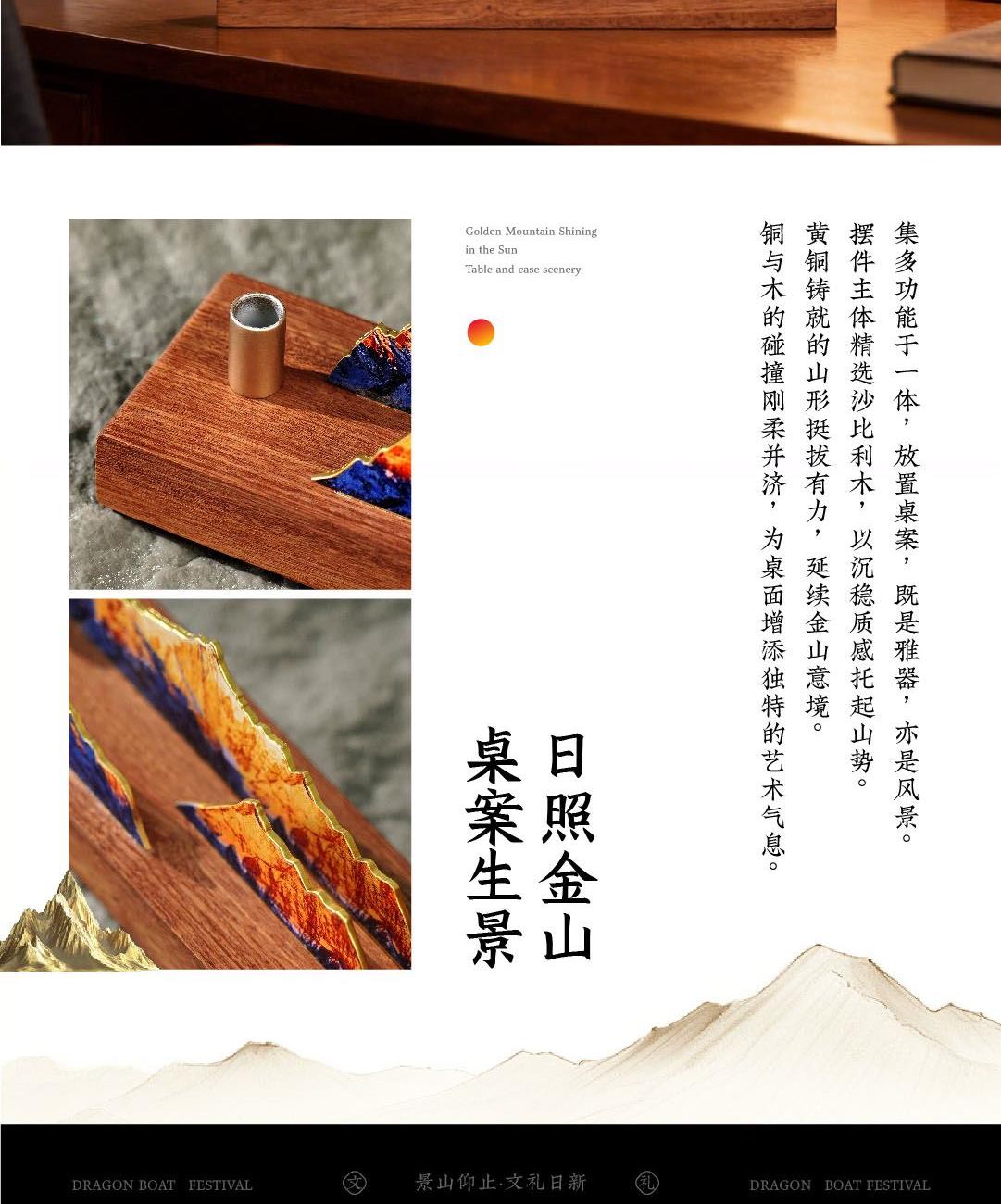 取意《诗经》“高山仰止,景行行止”之哲思。我们将日照金山那份光落山巅、万物同辉的壮丽,化为一件可伴日常的桌案雅物。山形为骨,光影为韵,黄铜与沙比利木刚柔相济,为方寸书案注入磅礴意境。当灯光亮起,光芒不独照亮一隅,更照见你心向高处、行至远方的坚定力量。这份「景山仰止·文礼日新」礼盒,是精神的外化与陪伴,亦是一份美好的寄寓。在光影流转间,它将陪伴每一次思考与落笔,见证你心中志向的勃发与从容气度。