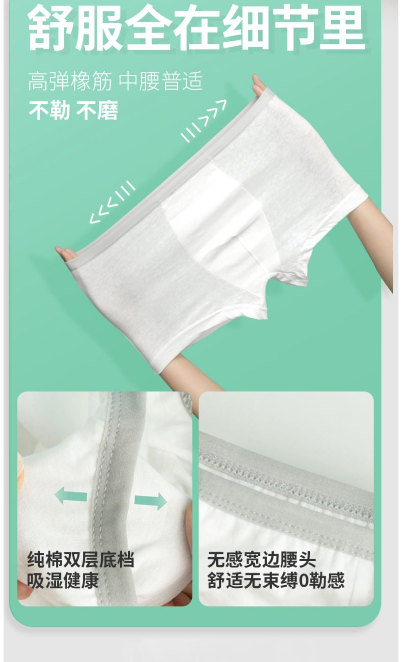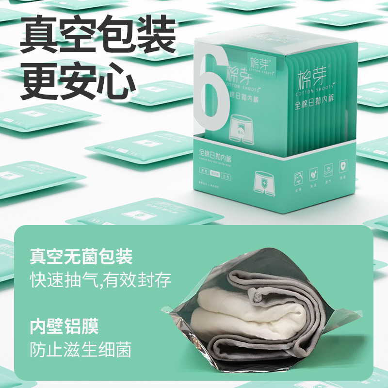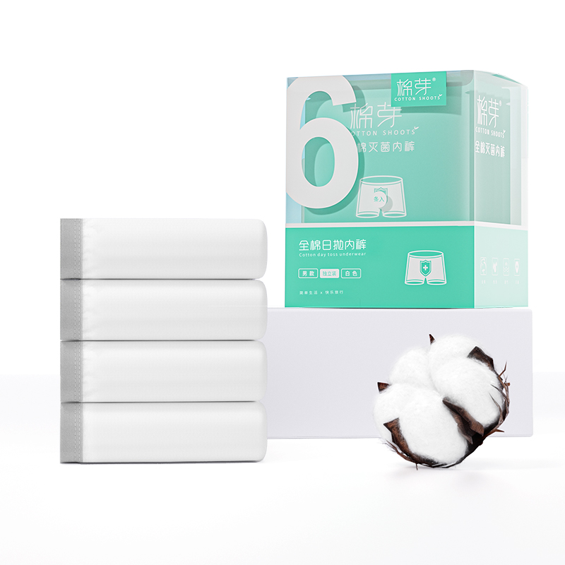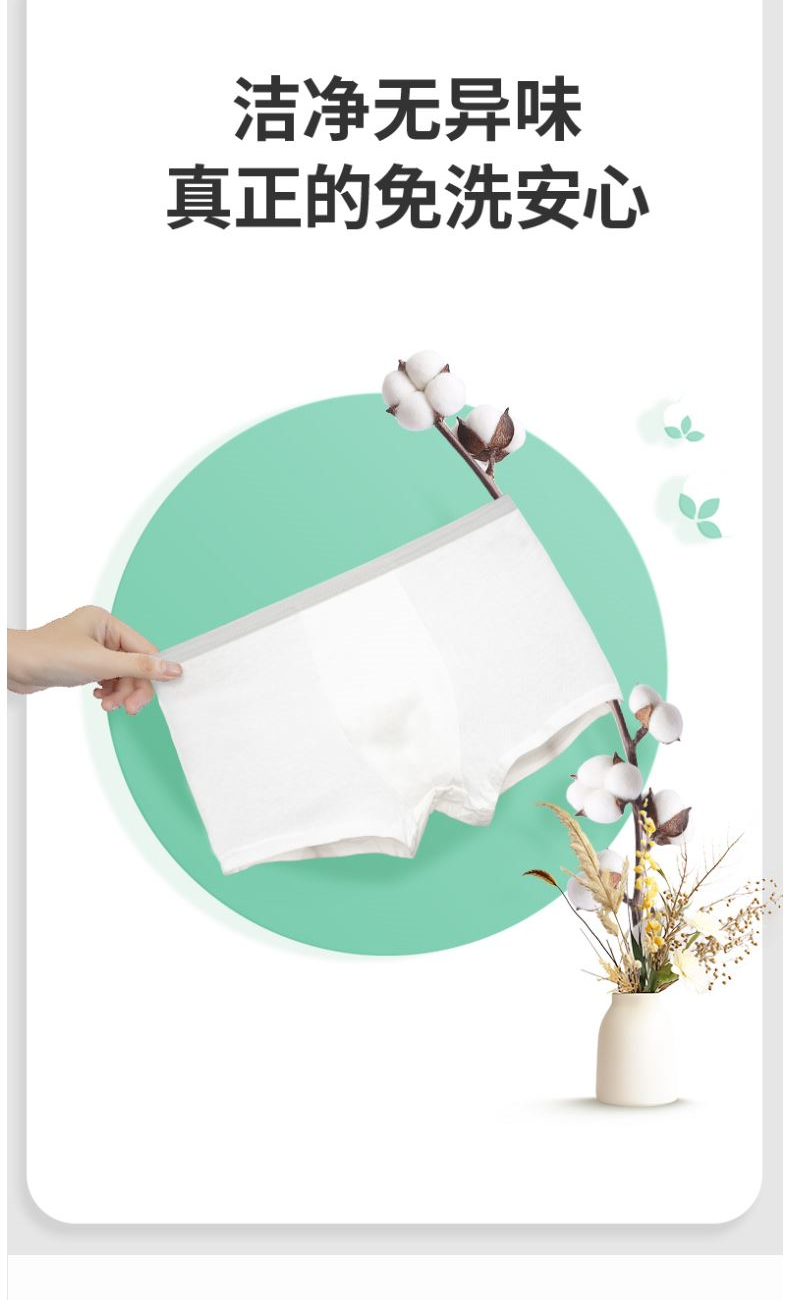 尺码:XL/XXL/3XL/4XL 材质:棉(辅料除外) 净含量:6条/盒*1盒 核心利益点: 1、亲肤柔软、立体剪裁。 2、即拆即穿,穿完即丢,方便出行。 3、铝膜袋真空包装、干净卫生。