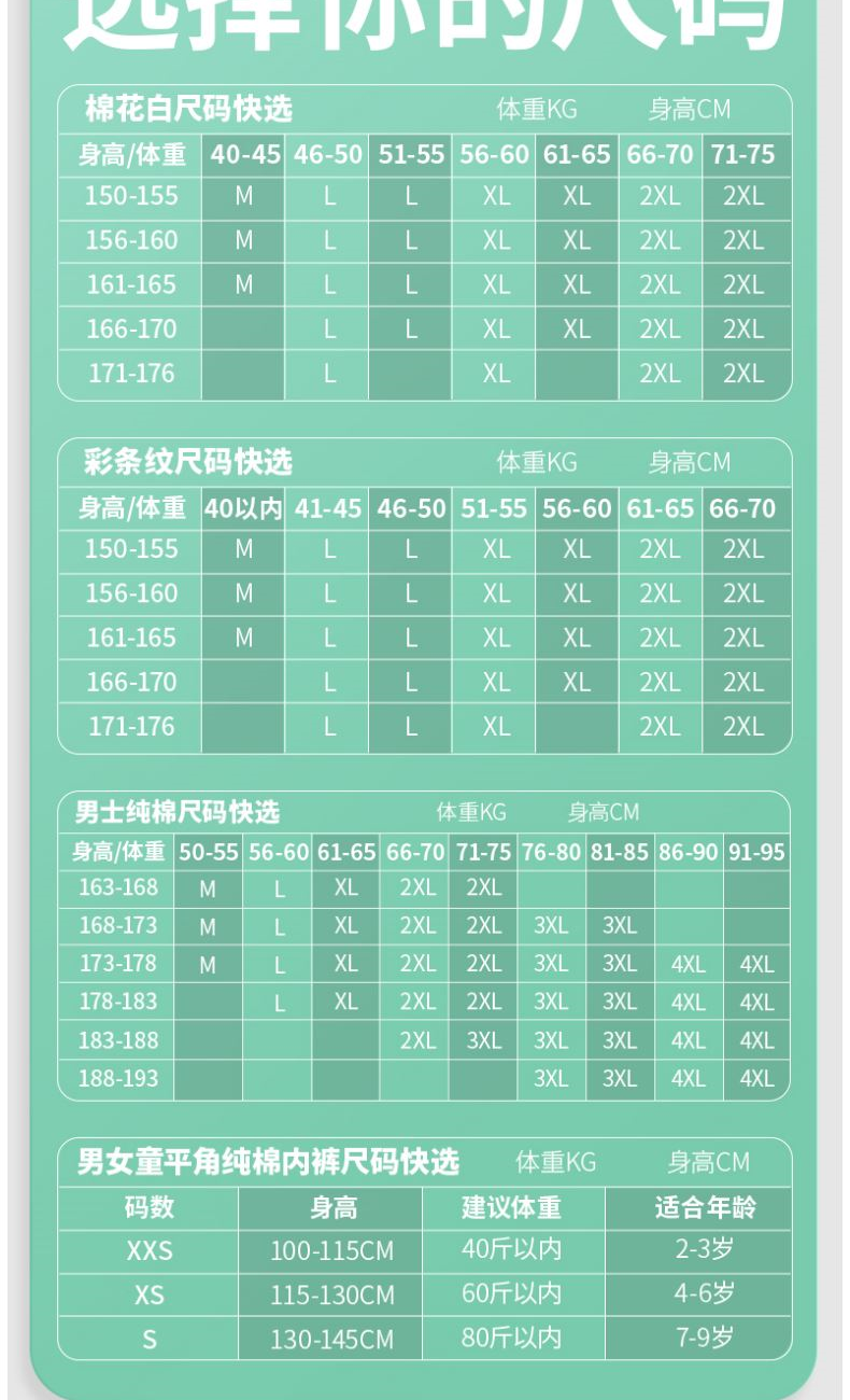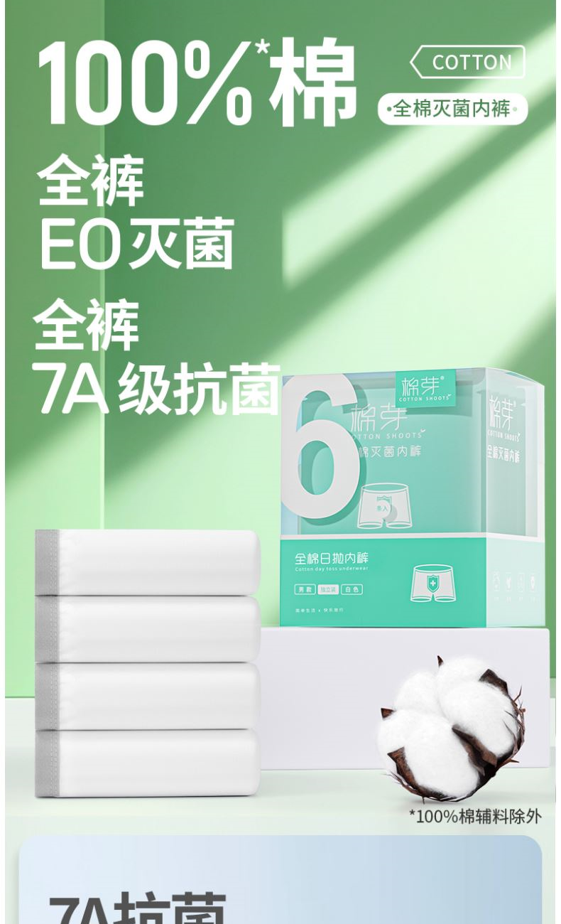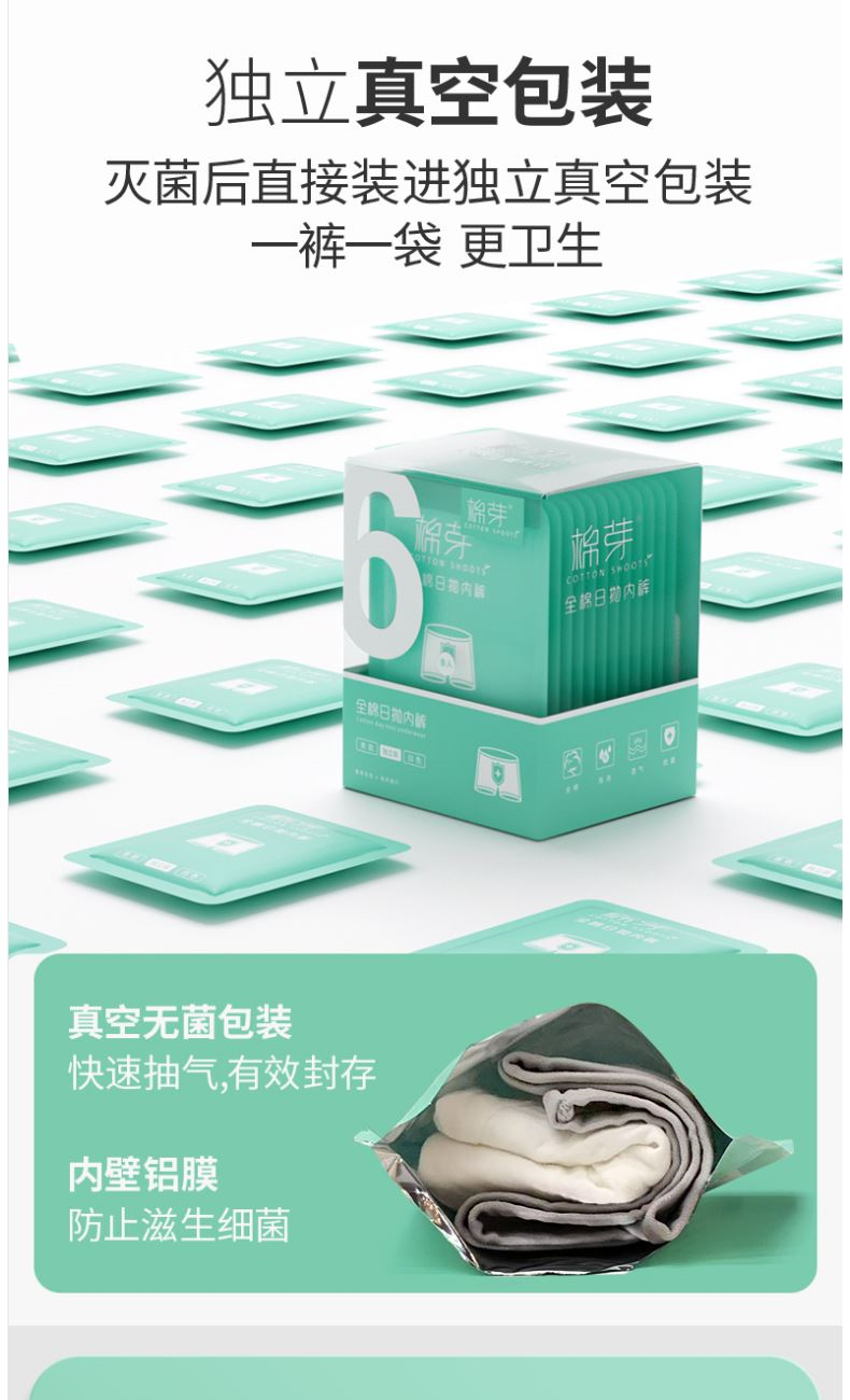 尺码:XL/XXL/3XL/4XL 材质:棉(辅料除外) 净含量:6条/盒*1盒 核心利益点: 1、亲肤柔软、立体剪裁。 2、即拆即穿,穿完即丢,方便出行。 3、铝膜袋真空包装、干净卫生。