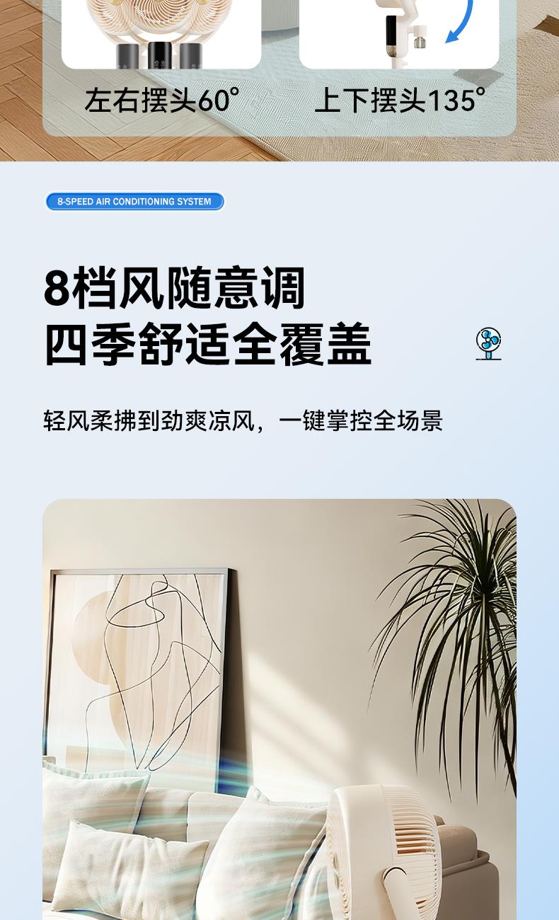 ◁全域自动摆头 上下左右全自动立体摆头 实现全屋空气高效循环