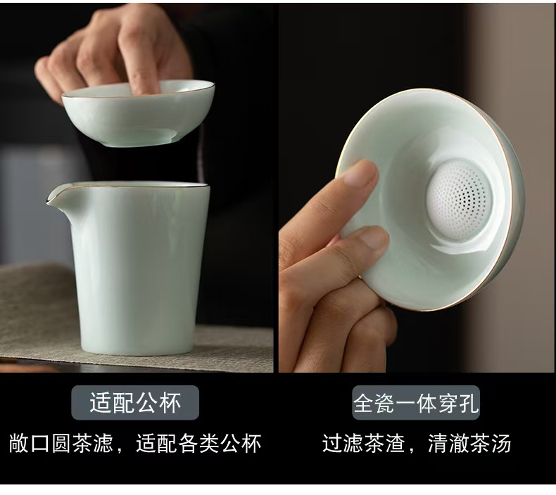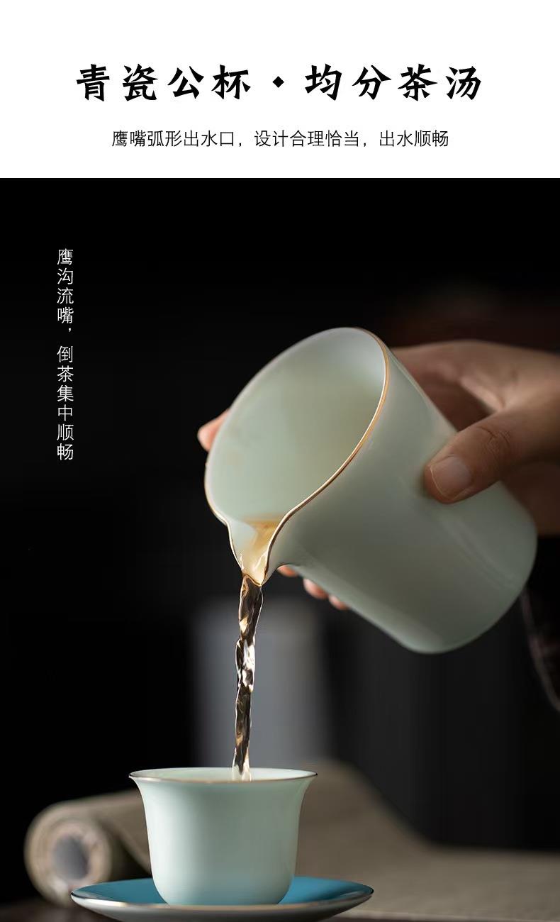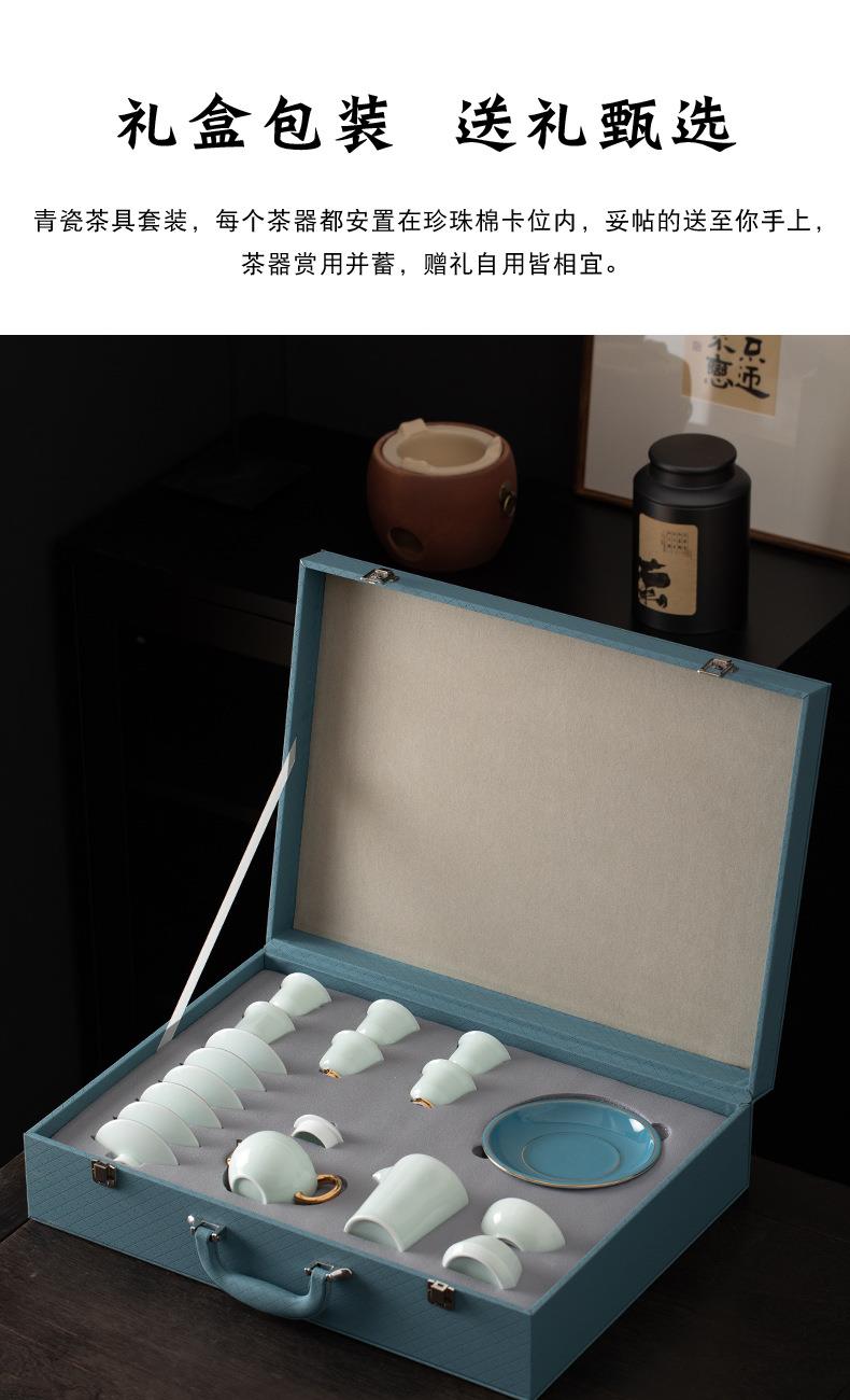 配制:1壶 6杯 1茶洗 1公道杯1茶托1茶漏 1锦盒 规格:壶:12*8cm 公道杯:9.2*9.1cm 茶杯:6cm*5cm 手提锦盒:39*27*13cm 材质:青山玉 24K真金 推荐说明:青山玉是青瓷新品,以瓷质细腻,线条明快流畅,色泽纯洁而斑斓著称。青如玉,明如镜,声如磬,描24K真金奢华装饰,被称为瓷器之花。