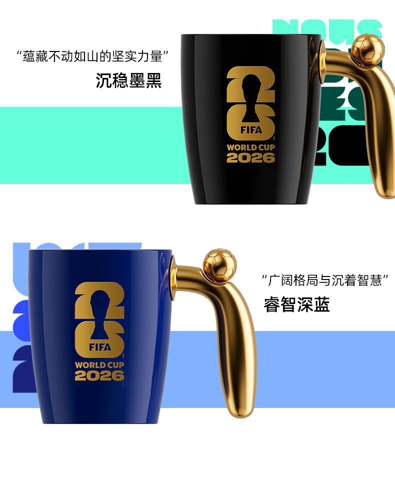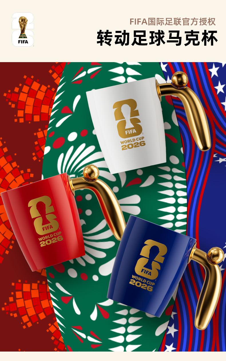 2026美加墨世界杯官方授权方 材料:陶瓷、合金 容量:420ml 产品尺寸:长145x宽110x高110mm 包装尺寸:长136x宽136x高116mm 可以转动的足球马克杯 四年一次的足球盛宴 纪念版商品
