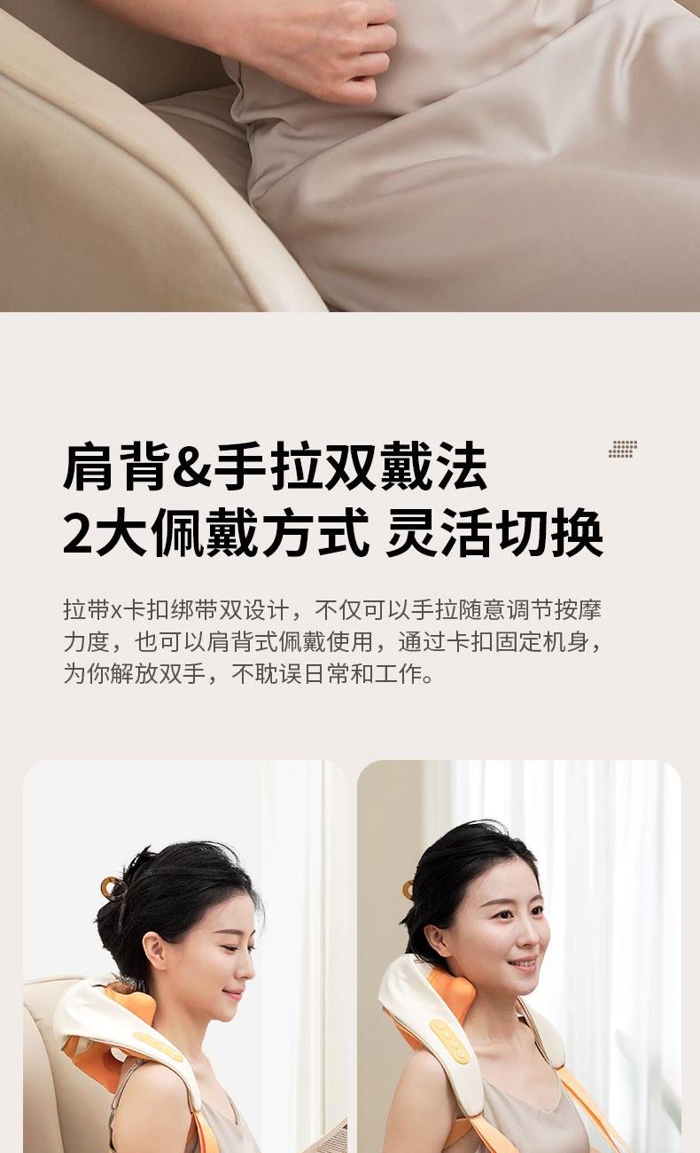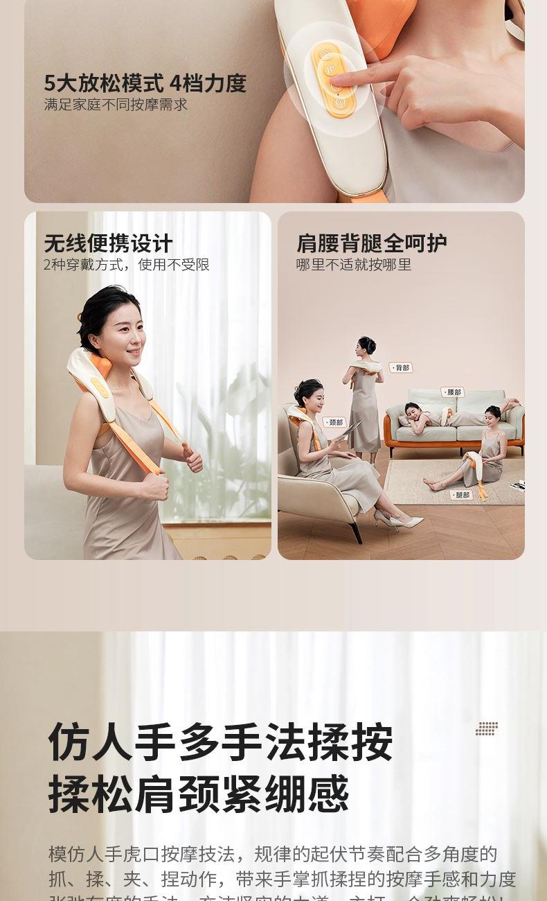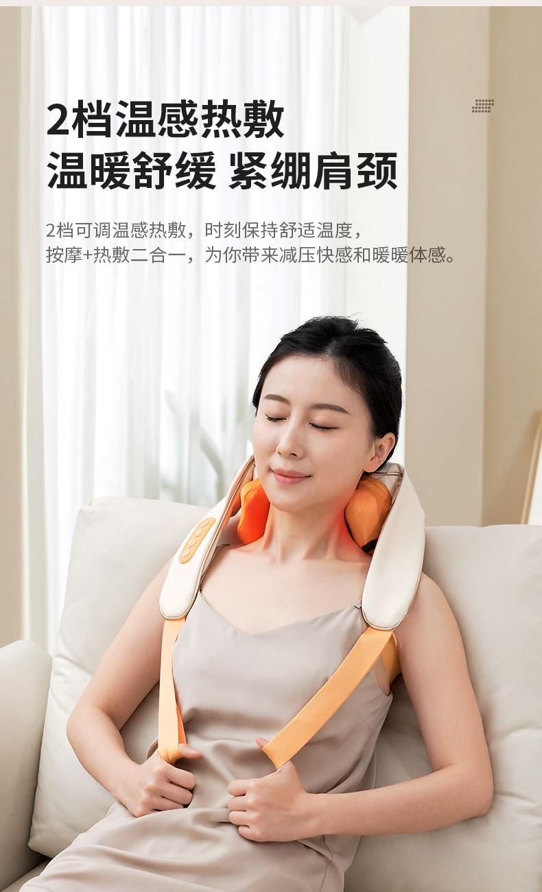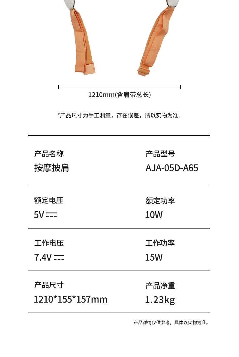 额定电压:5V 额定功率:10W 工作电压:7.4V 工作功率:15W 材 质:PU皮 > 穿戴便捷,解放双手,适合办公、居家等多场景使用 > 五种模式可选,四档力度,低高挡两种加热 > 满足多种需求,简单易操作,一键轻松掌控 > 模拟人手虎口八字揉拿法,拿捏斜方肌 > 斜方肌、肩颈、腿部等按摩,一机多用途