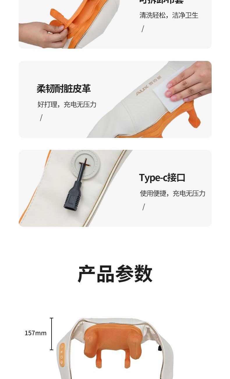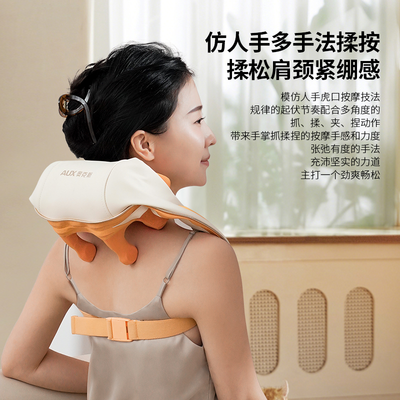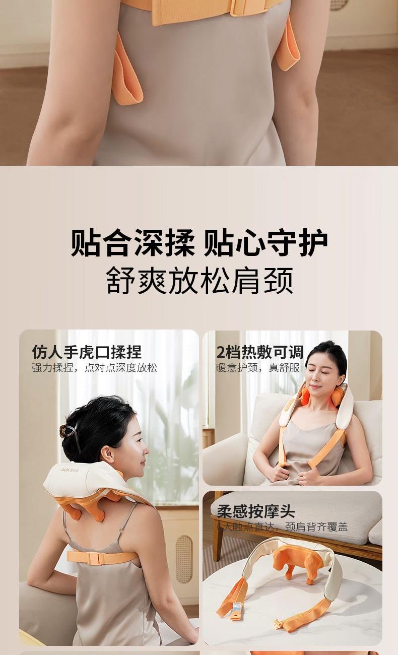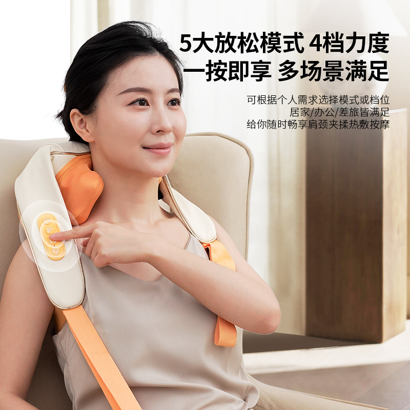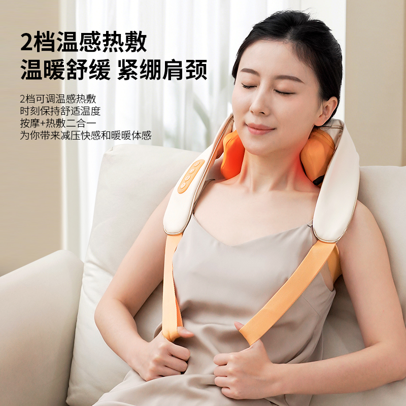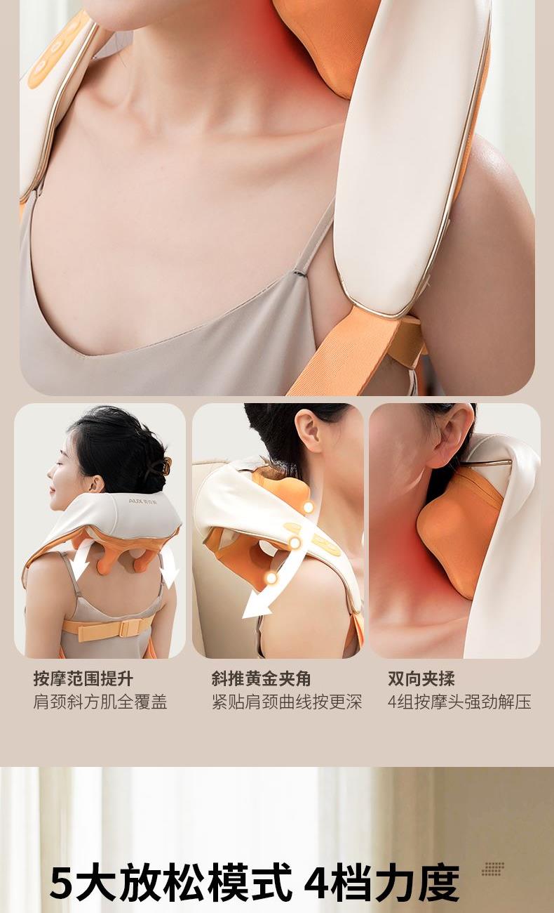 额定电压:5V 额定功率:10W 工作电压:7.4V 工作功率:15W 材 质:PU皮 > 穿戴便捷,解放双手,适合办公、居家等多场景使用 > 五种模式可选,四档力度,低高挡两种加热 > 满足多种需求,简单易操作,一键轻松掌控 > 模拟人手虎口八字揉拿法,拿捏斜方肌 > 斜方肌、肩颈、腿部等按摩,一机多用途