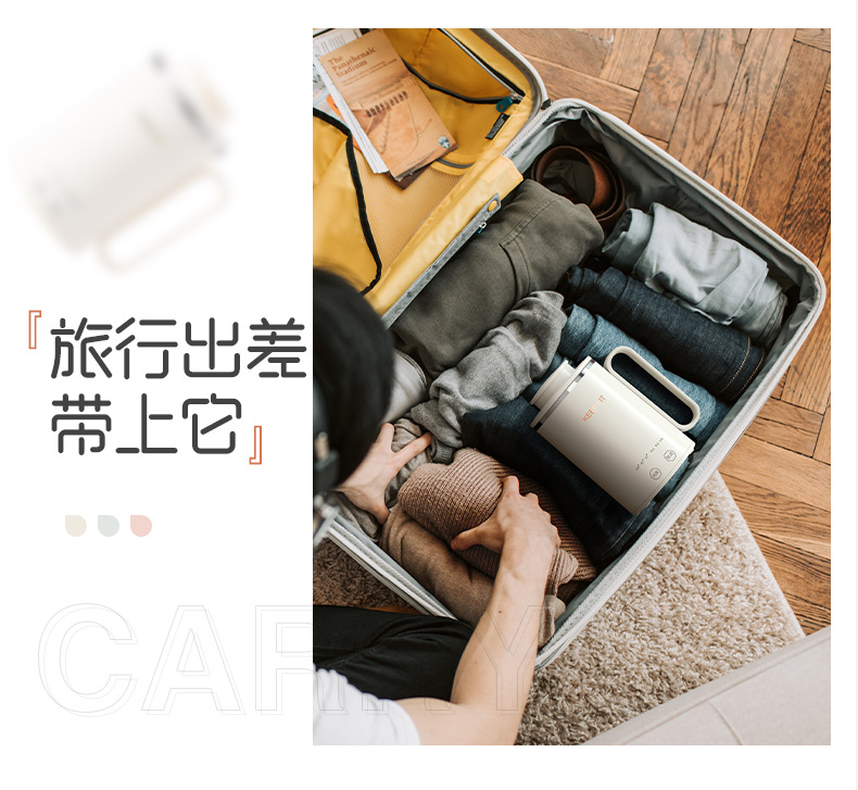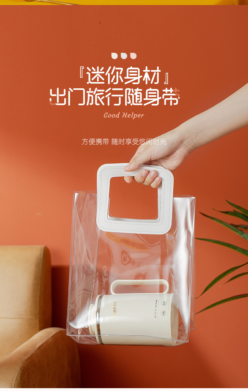 额定功率:300W 额定电压:220V 产品颜色:元气绿/樱花粉/象牙白 产品容量:400ML 产品款式:机械款-礼盒包装 包装清单:主机、滤网、电源线、玻璃盖、说明书 包装尺寸:13*13*17.5(cm) 特色功能 礼盒包装 1、食品级食品可接触304不锈钢内胆 耐腐蚀材质 2、携带方便,出行好伴侣,轻巧实用颜值高 3、机械款方便操作,即插即用人体工程学 4、舒适提手,细密滤网,透气盖口 5、电热杯/水杯二合一,机械款开关档