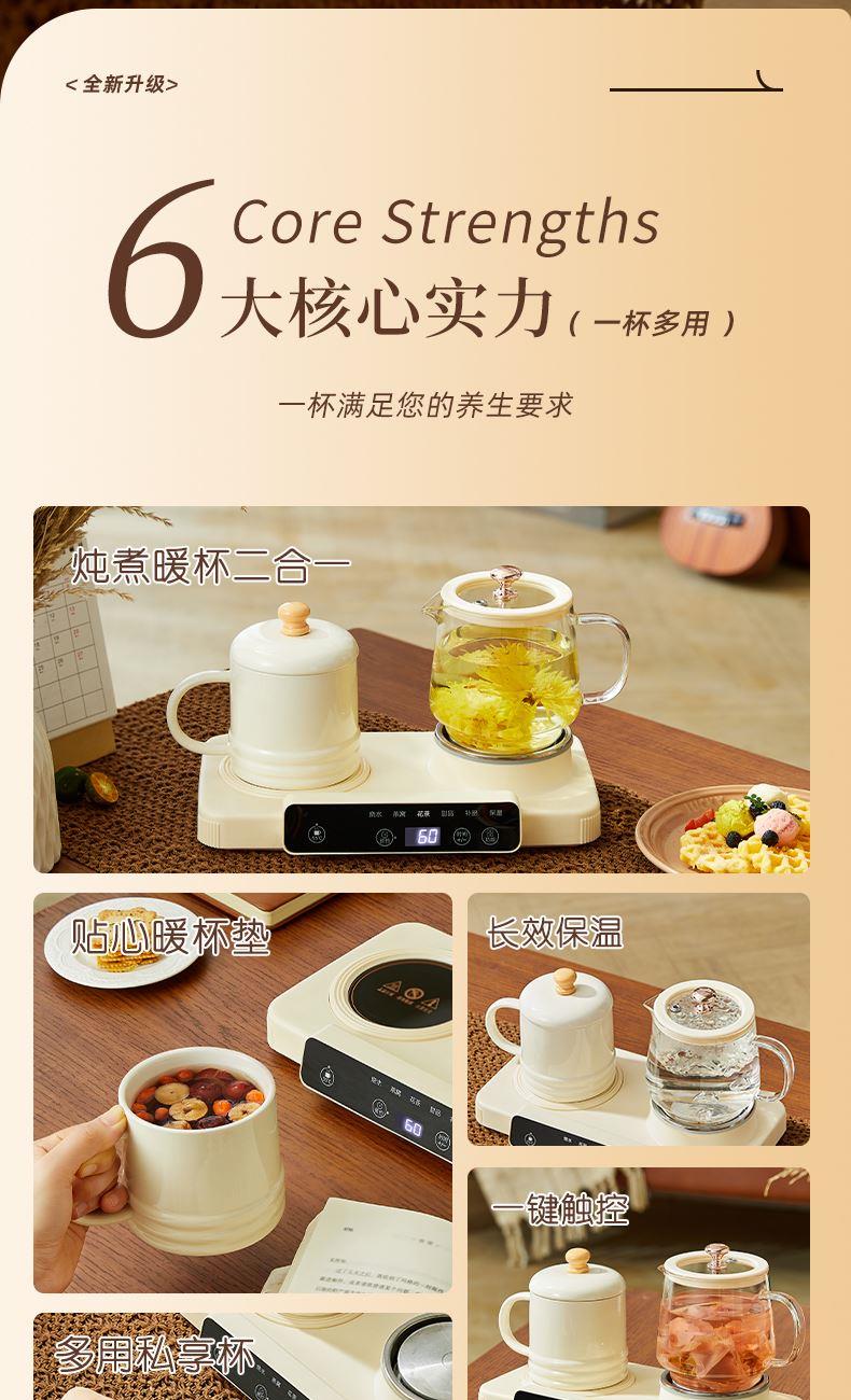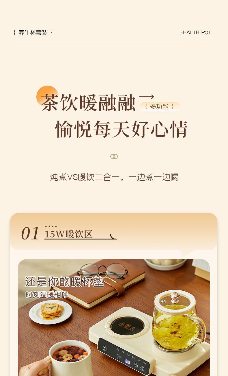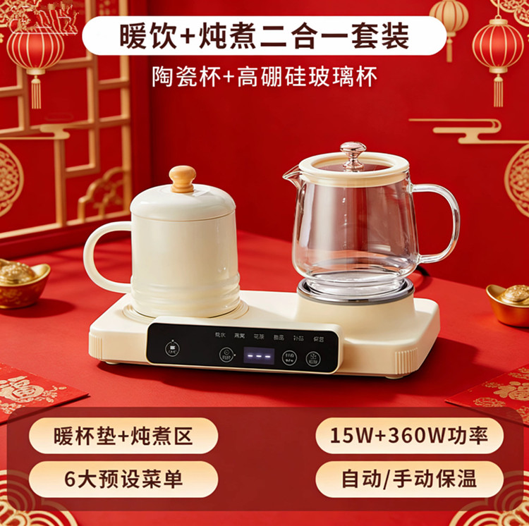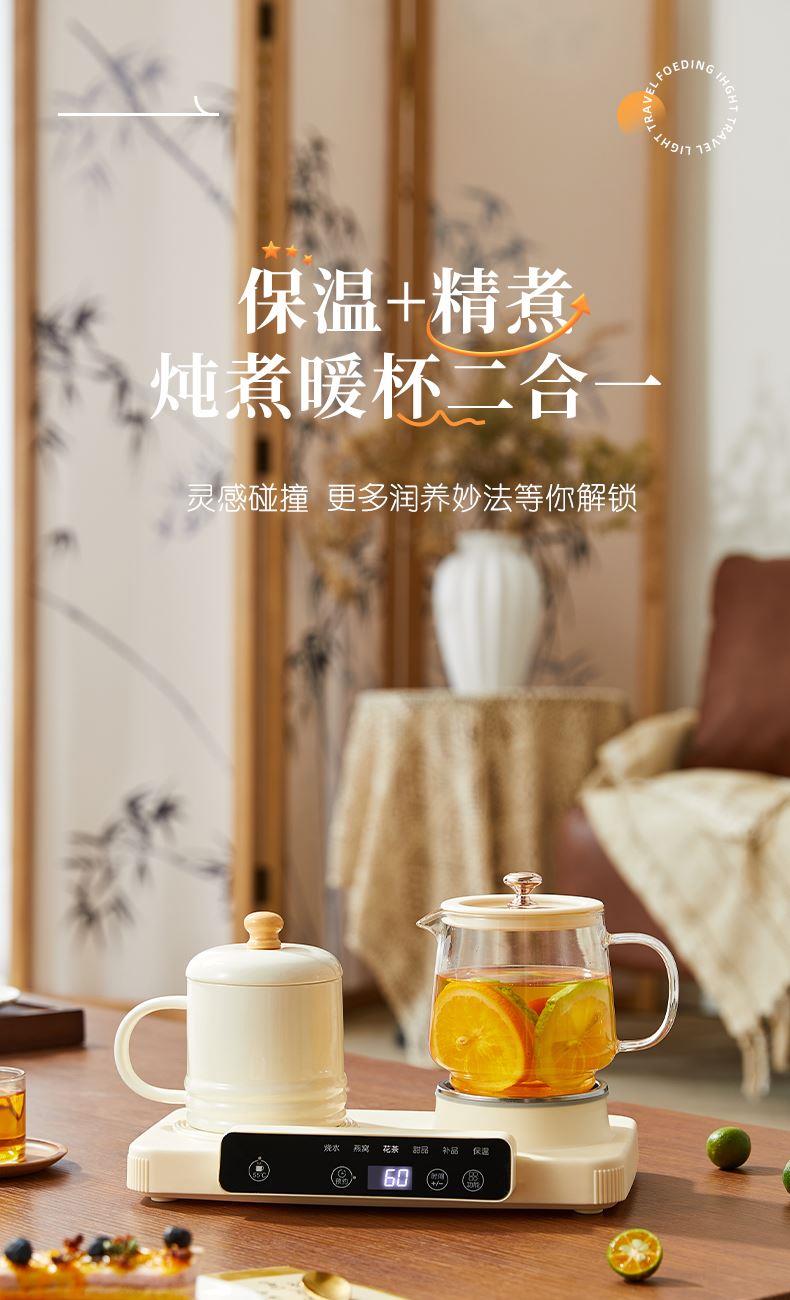 2、1壶1杯一套装,6大预设功能,15W暖饮,375W炖煮;