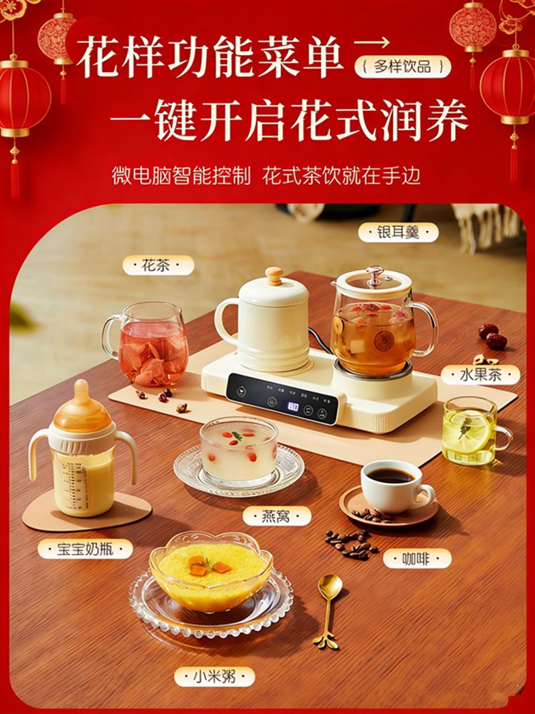 1、双底座养生壶炖煮二合一,左边保温,右边炖煮同享;