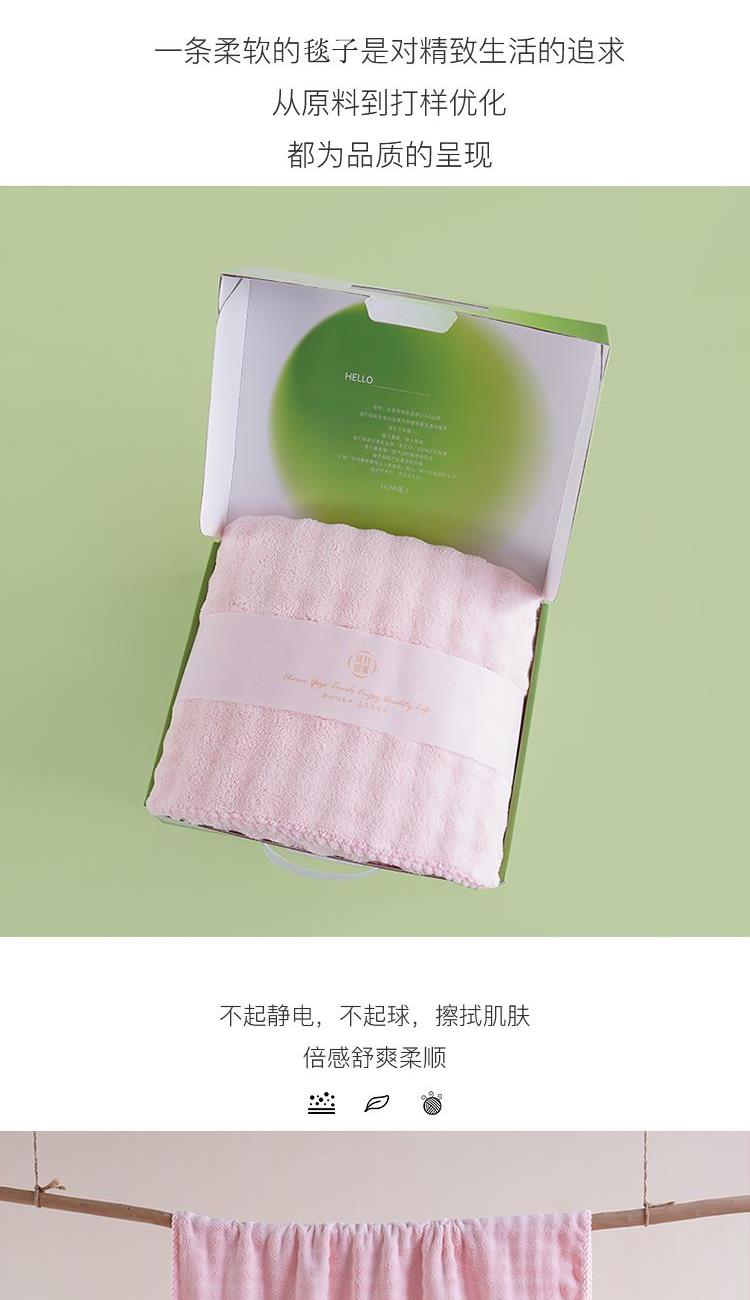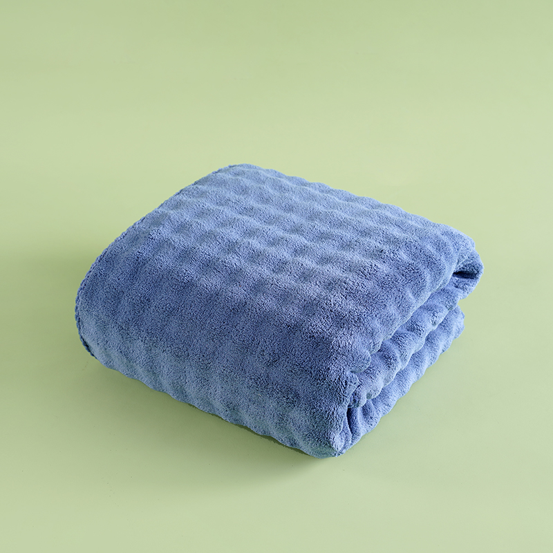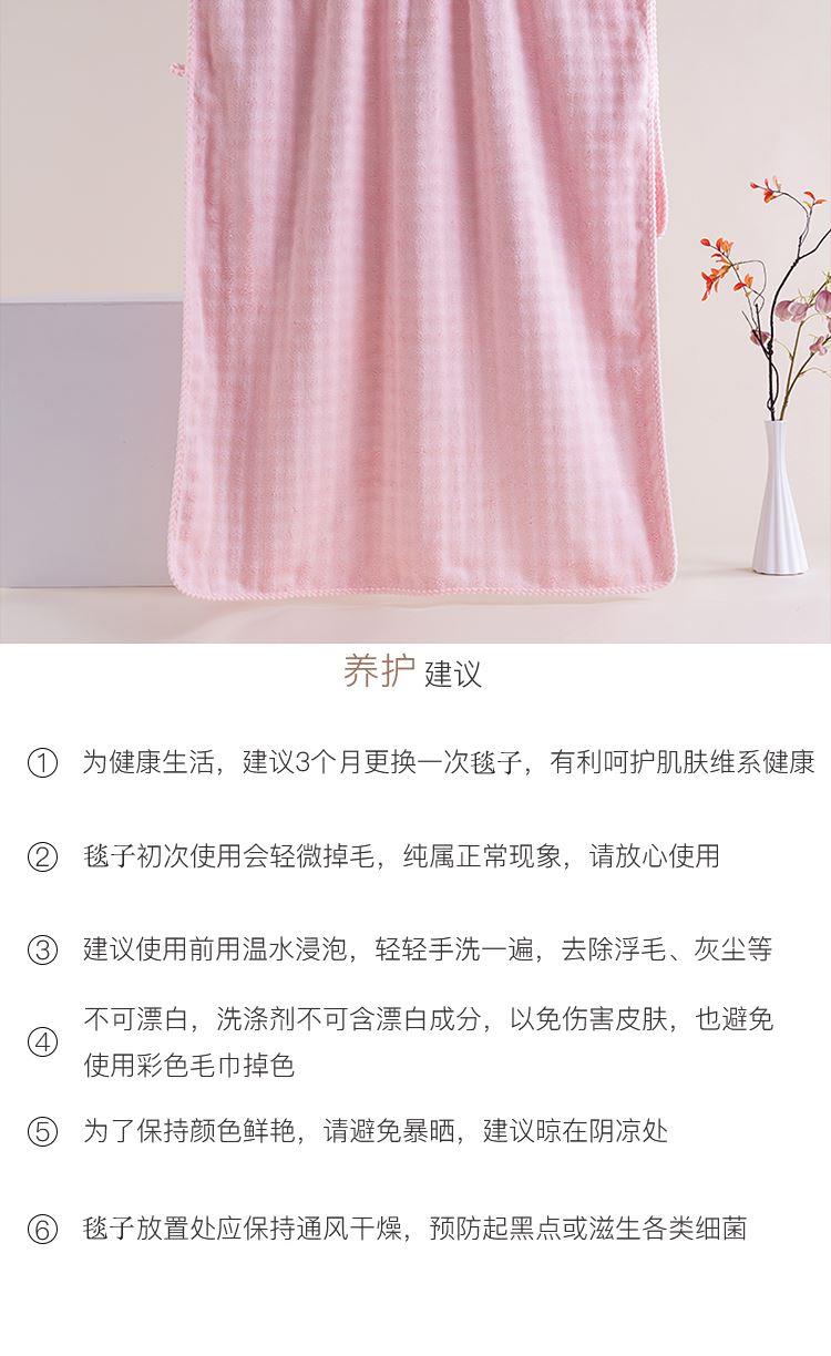 产品型号:泡泡绒-1 规格:毯子90*170cm 克重:550g 材质:微米纱 颜色:随机 组装形式:1毯子 采用微米纱工艺,纤维细度仅为头发1/280,吸水量为纯棉产品的7倍,手感绵柔,温暖的莫兰迪色系带给你不仅仅是视觉感官的温柔体验,更重要的是回归内心的平静与笃定
