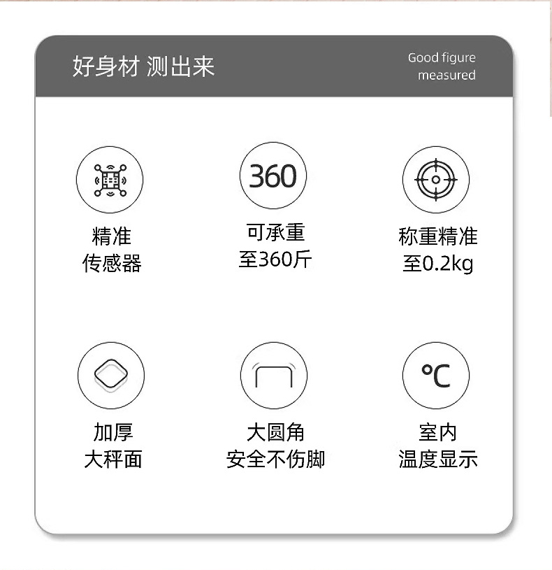 输入电压:DC 5V 额定功率:0.2W 单位选择: kg/斤 产品材质:钢化玻璃 称量范围:0.2-180kg 显示方式:4位液晶显示 产品尺寸:260*260*21mm 传感器测量,微小的进步,也值得被看见 精雕细琢每一面,轻薄不单薄,承重可达360斤 液晶显示屏,清晰读数,无惧黑夜 智能感应开关,节能省电,充一次用半年 助你尽情开练,重塑自信轮廓,雕刻出属于自己的高能时刻!