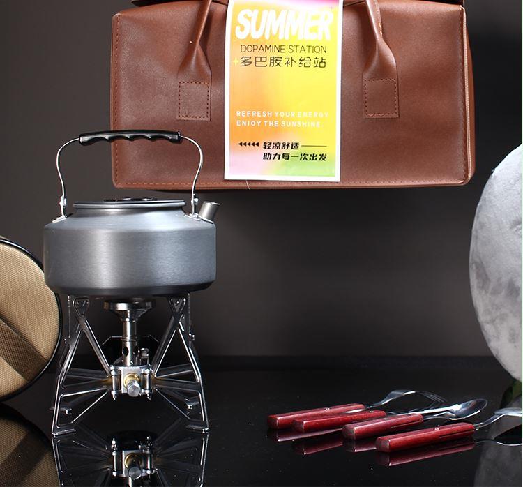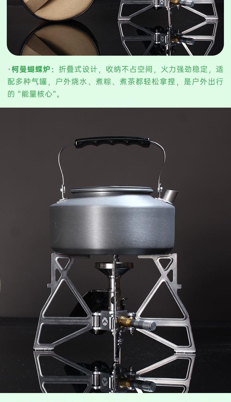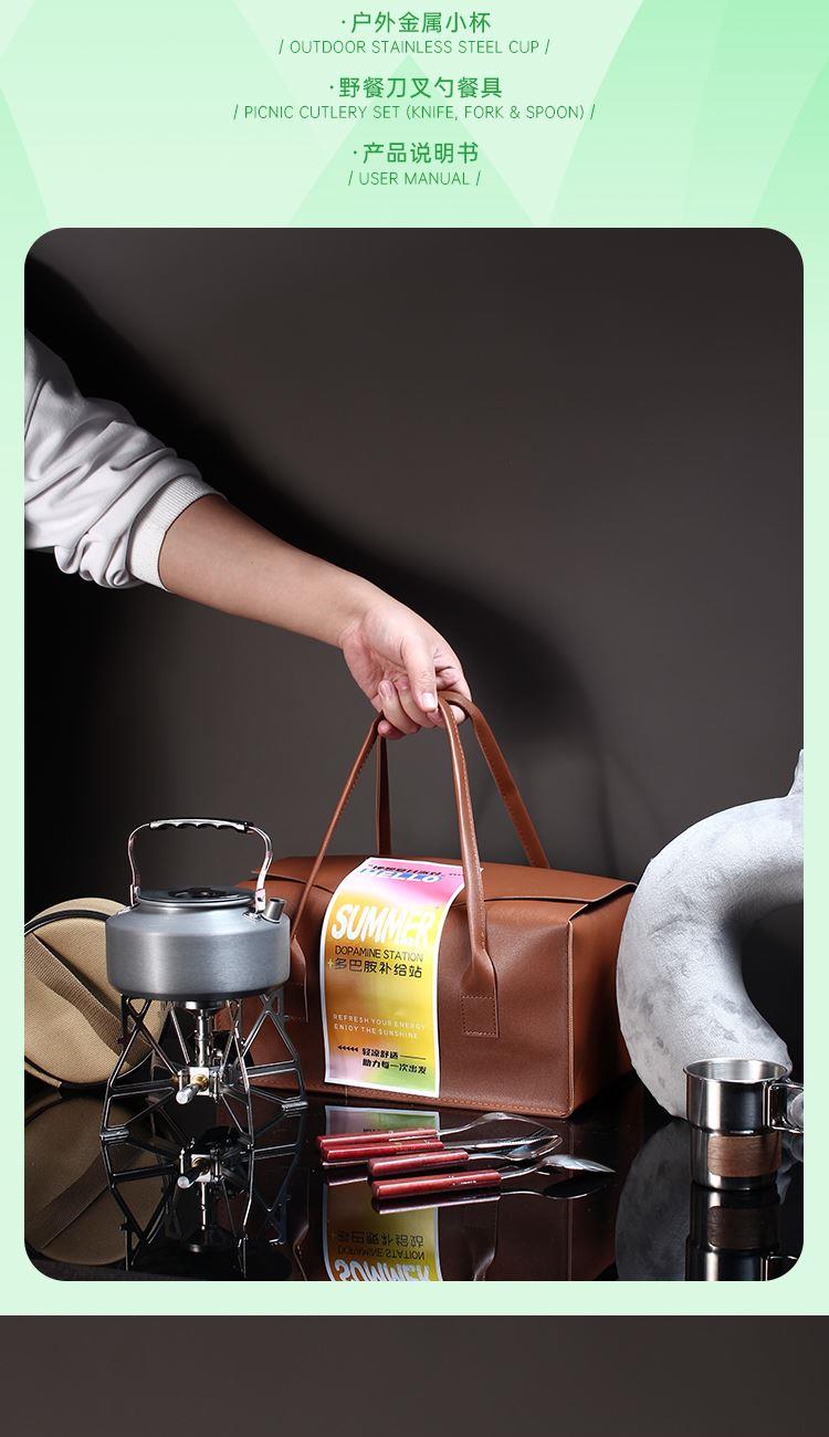 配置 手提式便携旅行皮包*1户外颈枕*1 五芳斋粽x4只(蜜枣粽*2-鲜肉粽*2) 柯曼蝴蝶炉*1 柯曼户外烧水壶*1 容量2L(均配独立收纳) 户外金属小杯*1 野餐刀叉勺餐具*1套说明书*1 材质 户外水壶:铝合金 1 蝴蝶炉:铝合金不锈钢黄铜 皮革 填充记忆棉 尺寸 烧水壶:185*180*112mm 卡式炉:195*120*150(收纳包170*70mm) 手提皮包:340*200*165mm