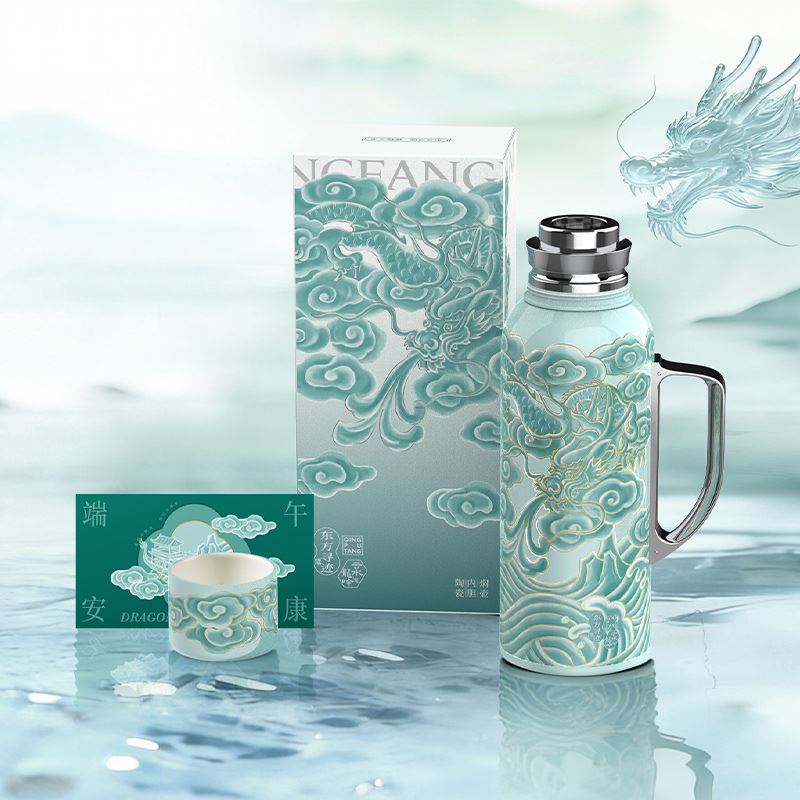 配置 · ① 陶瓷内胆焖壶×1把(820ml) (SUS-316内胆丨304外壳丨内胆/杯盖内壁喷瓷) ② 无火香氛液×1瓶(200ml-乌木沉香) ③ 龙舟纸框景×4片 ④ 香液扩香棒×1套 ⑤ 发芽糙米粽×2只(100g/只) ⑥ 超大海鸭蛋×2只(80g/只) ⑦ 端午礼卡×1份 ⑧ 云水龙吟礼盒×1套(含袋) 尺寸 · 380×275×95mm