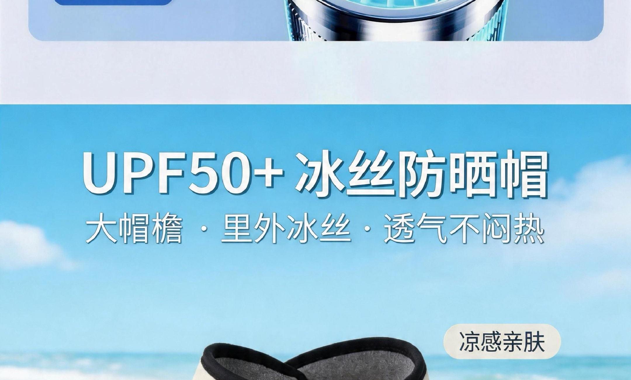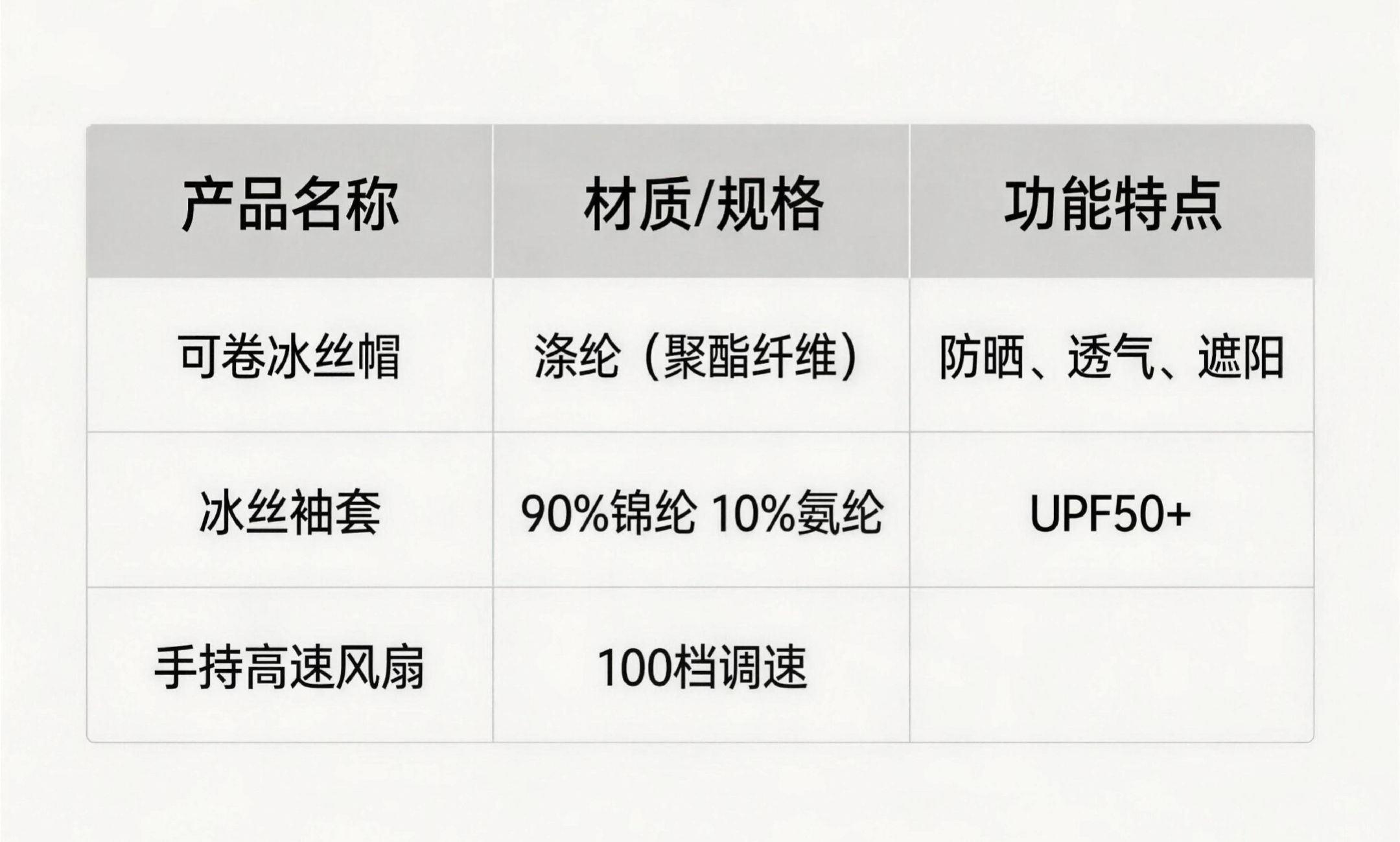 配置: 可卷双面冰丝帽*1 手持高速风扇*1 冰丝袖套*1 主要材质和功能: 可卷冰丝帽:涤纶(聚酯纤维),防晒,透气,遮阳 冰丝袖套:UPF50+,90%锦纶10%氨纶 手持高速风扇:100档调速